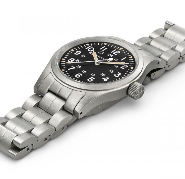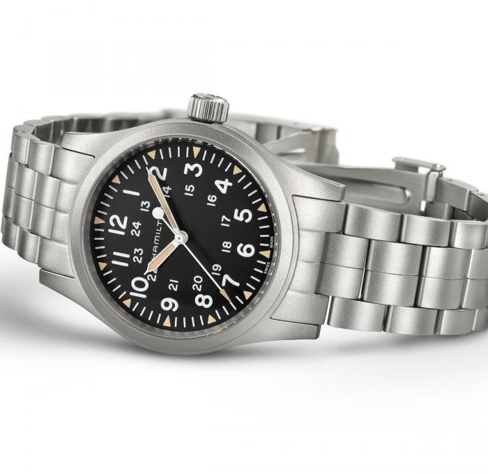 Hamilton Khaki Field Mechanical H69439131 to męski zegarek mechaniczny utrzymany w klasycznym stylu, zestawiony ze stalową bransoletą z zapięciem na sprzączkę. Koperta wykonana ze stali nierdzewnej ma tradycyjną średnicę 38 milimetrów, co zapewnia doskonały komfort noszenia i nawiązuje do historycznych wzorców. Czarna tarcza z czytelnym 24-godzinnym formatem czasu jest chroniona przez odporne na zarysowania szkło szafirowe. Wskazówki oraz indeksy zostały pokryte warstwą luminescencyjną, która po naświetleniu znacząco ułatwia odczyt godziny w trudnych warunkach oświetleniowych.