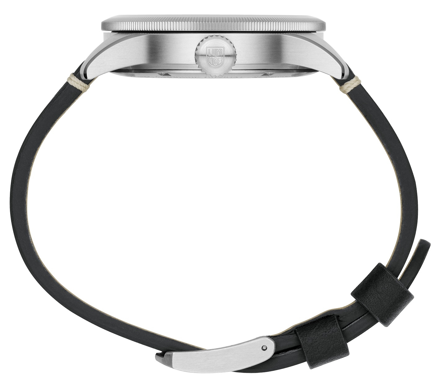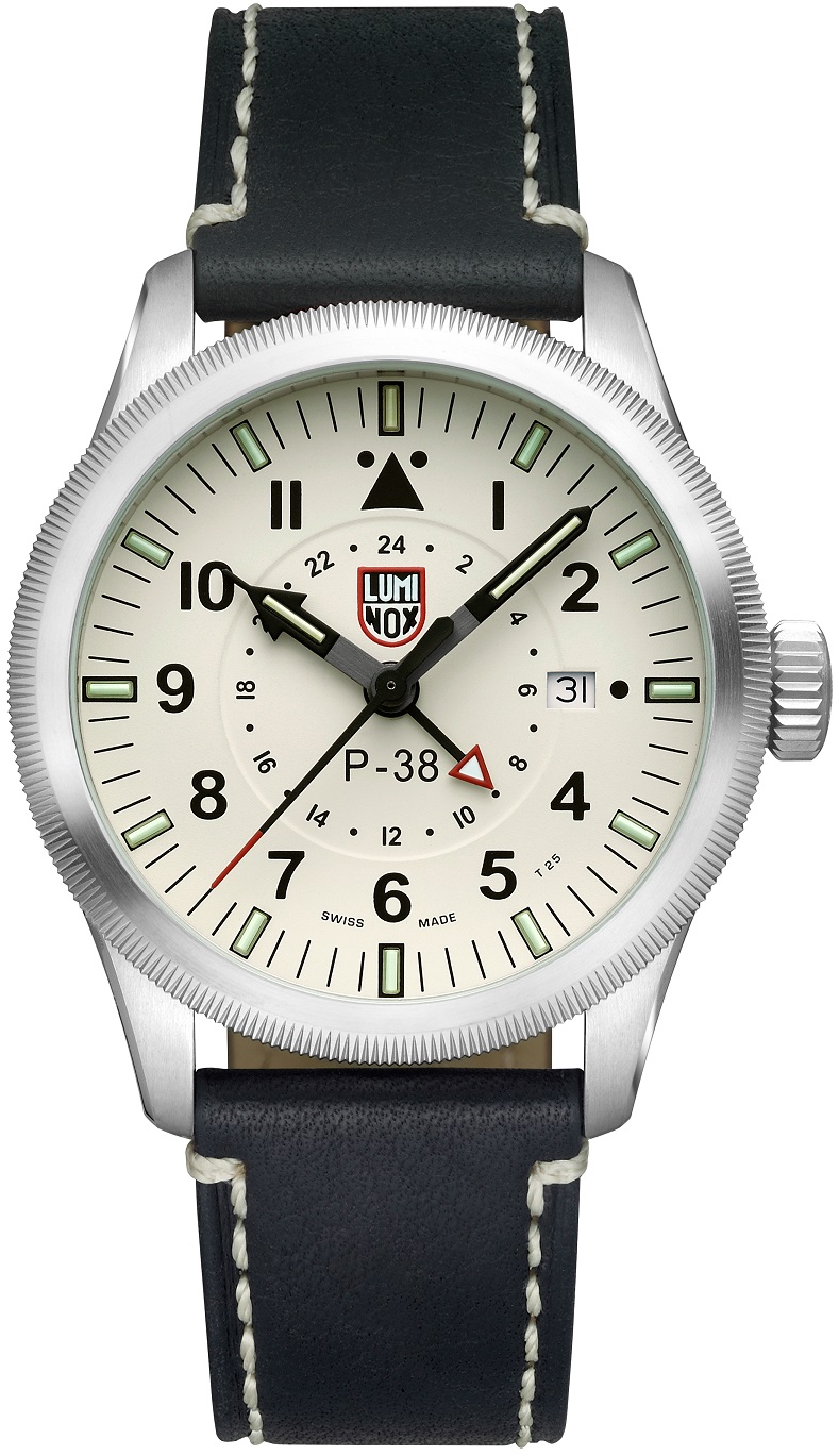 Ponadczasowy Luminox XA.9527 P-38 LIGHTNING® z 42-milimetrową kopertą wykonaną ze stali 316L, beżową tarczą i szafirowym szkłem jest wyposażony w czarny skórzany pasek ze sprzączką z wygrawerowanym logo Luminox.