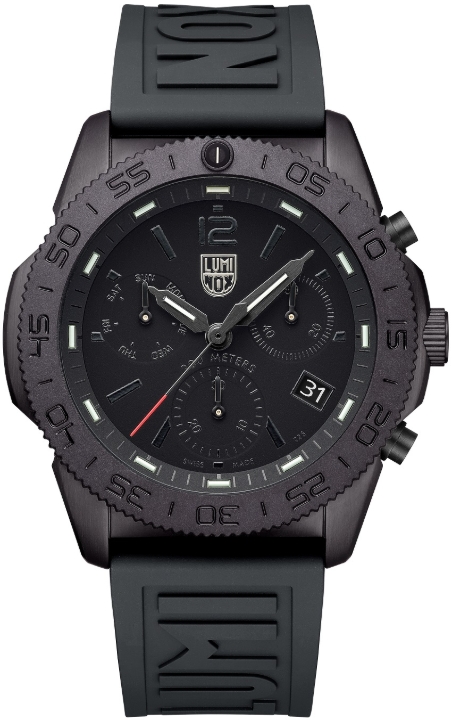 Luminox XS.3141.BO.1.SET Pacific Diver Chronograph posiada 44-milimetrową kopertę ze stali nierdzewnej z jednokierunkowym pierścieniem CARBONOX™, co jest niezbędnym instrumentem dla każdego nurka.