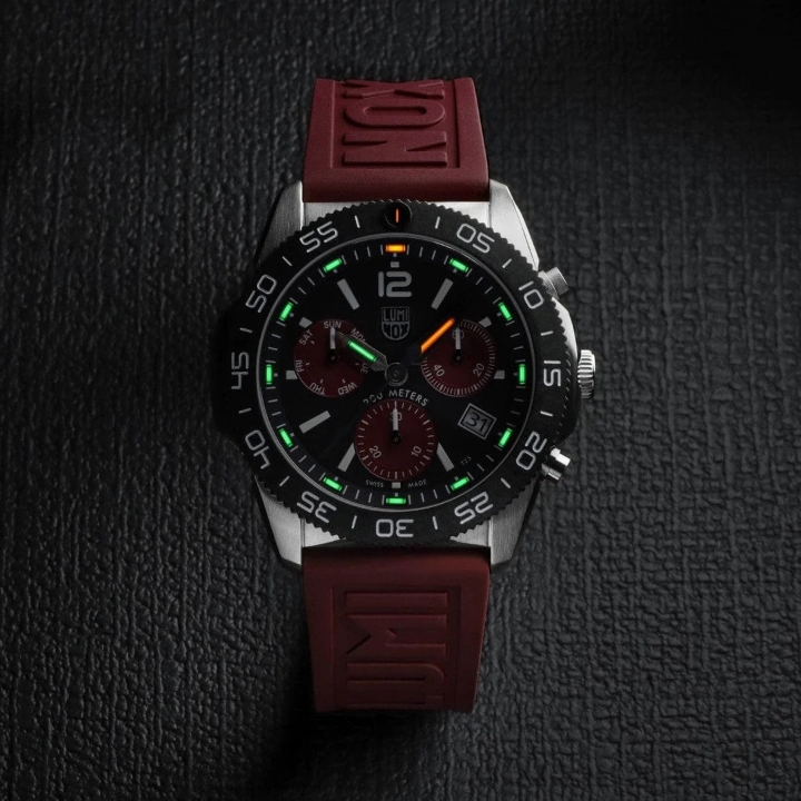 Luminox XS.3155.1.SET Pacific Diver Chronograph posiada 44-milimetrową kopertę ze stali nierdzewnej z jednokierunkowym pierścieniem CARBONOX™, co jest niezbędnym instrumentem dla każdego nurka.