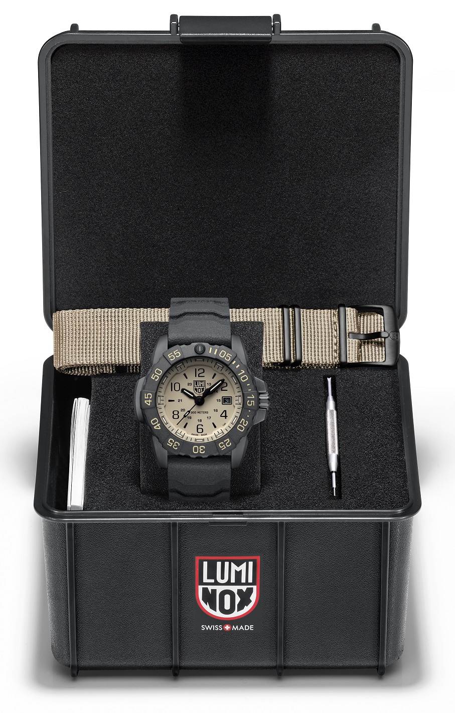 Zegarek Luminox XS.3251.CBNSF.SET Navy SEAL Foundation łączy wszechstronność z funkcjonalnością. Zegarek oferuje zestaw dwóch pasków: gumowy i nylonowy. 45-milimetrowa stalowa koperta z tarczą w kolorze piaskowym i bezelem wykonanym z CARBONOX™. Zegarek napędza szwajcarski mechanizm kwarcowy RONDA 715.