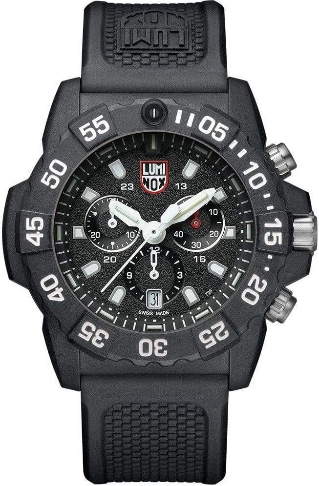 Luminox XS.3581 Navy SEAL Chronograph zachwyca 45-milimetrową kopertą CARBONOX™ i wodoodpornością do 200 metrów, gdzie z powodzeniem może być używany do nurkowania.
