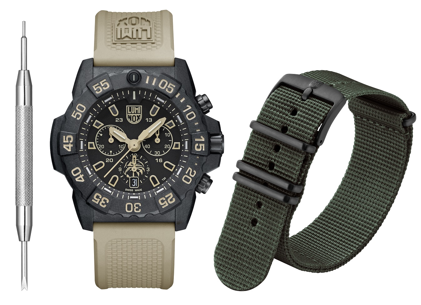 Luminox XS.3590.NSF.SET Chronograf Navy Seal Foundation ma elegancką czarną tarczę z piaskowymi detalami tarczy i trzema subtarczami, a logo NSF jest sprytnie umieszczone na podtarczy na godzinie 6.