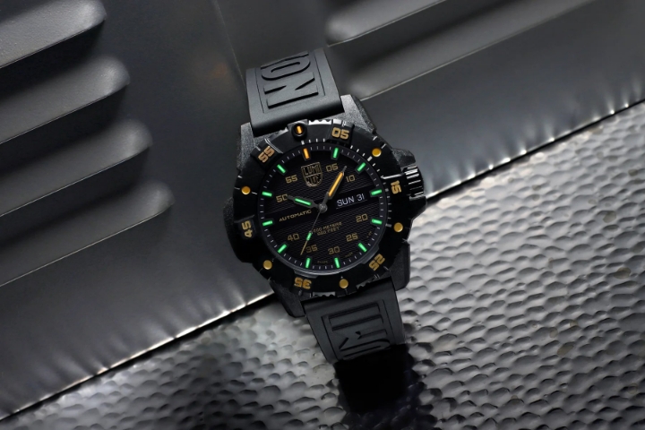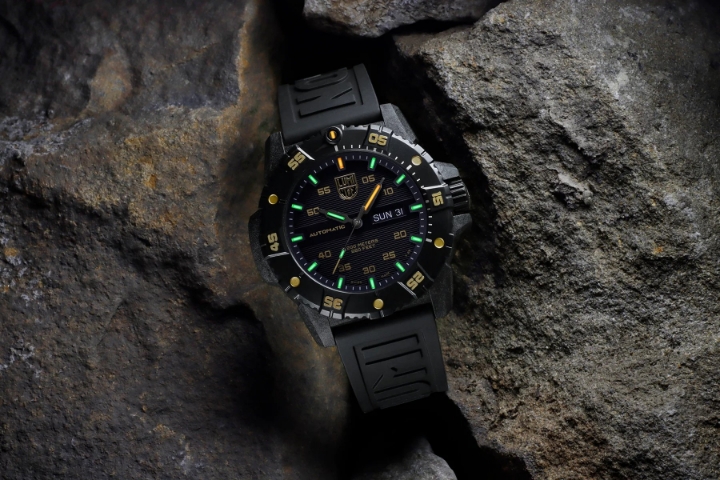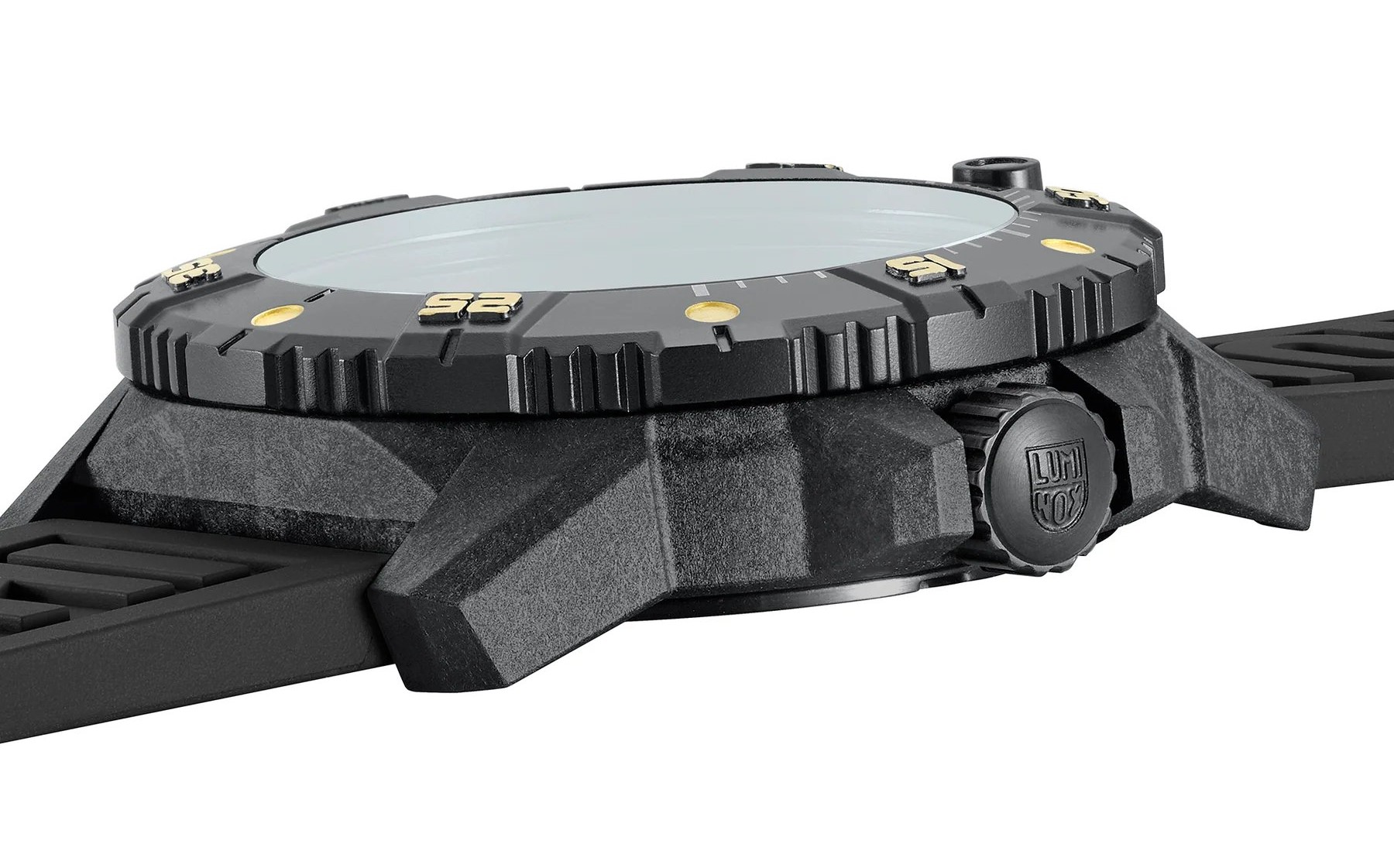 Obudowa wykonana jest z opatentowanego przez Luminox materiału CARBONOX+™, który jest trzy razy lżejszy od tytanu, zapewniając zarówno wytrzymałość, jak i wygodę. Czarny pierścień ze stali nierdzewnej 316L z powłoką IP i czarny pasek z gumy ciętej na wymiar zapewniają solidną konstrukcję przy zachowaniu eleganckiej i nowoczesnej estetyki.