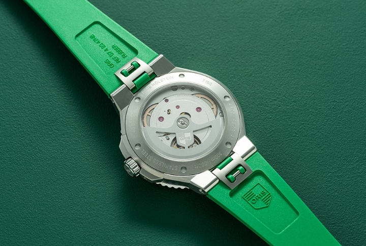 Oris Aquis Date 01 400 7790 4157-07 4 23 47EB to męski zegarek automatyczny na zielonym gumowym pasku ze składanym zapięciem. Koperta ze stali nierdzewnej ma średnicę 43,5 milimetra, przezroczysty dekiel i jednokierunkowo obracający się bezel z ceramiczną wkładką ze skalą do nurkowania. Zielona tarcza ze szlifem słonecznym i datownikiem na godzinie szóstej jest chroniona wytrzymałym szkłem szafirowym z powłoką antyrefleksyjną. Wskazówki, indeksy i część bezela pokryte są powłoką luminescencyjną Super-LumiNova®, która gwarantuje doskonałą czytelność w warunkach słabego oświetlenia. Zegarek napędzany jest manufakturowym mechanizmem Oris 400 z naciągiem automatycznym i ponadstandardową rezerwą chodu wynoszącą 5 dni. Mechanizm ma dwie sprężyny główne i brakuje mu tradycyjnego czerwony rotor, który odróżnia kaliber 400 od markowych modeli o regularnych mechanizmach. Oprócz pięciodniowej rezerwy chodu mechanizm oferuje również zwiększoną odporność na magnetyzm, czemu sprzyjają między innymi krzemowa armatura i koło krokowe. Oris zaleca okres międzyobsługowy dla tego mechanizmu wynoszący 10 lat, czyli dwukrotnie dłużej niż zalecany okres w przypadku zwykłych zegarków mechanicznych, a przede wszystkim tak bardzo wierzy w mechanizm, że daje na niego również 10-letnią gwarancję! To mechanizm z funkcją hakowania, który w razie potrzeby można również nakręcić ręcznie za pomocą sygnowanej zakręcanej koronki. Wodoodporność zegarka wynosi 30 ATM, co czyni go odpowiednim wyborem do snorkelingu i nurkowania.