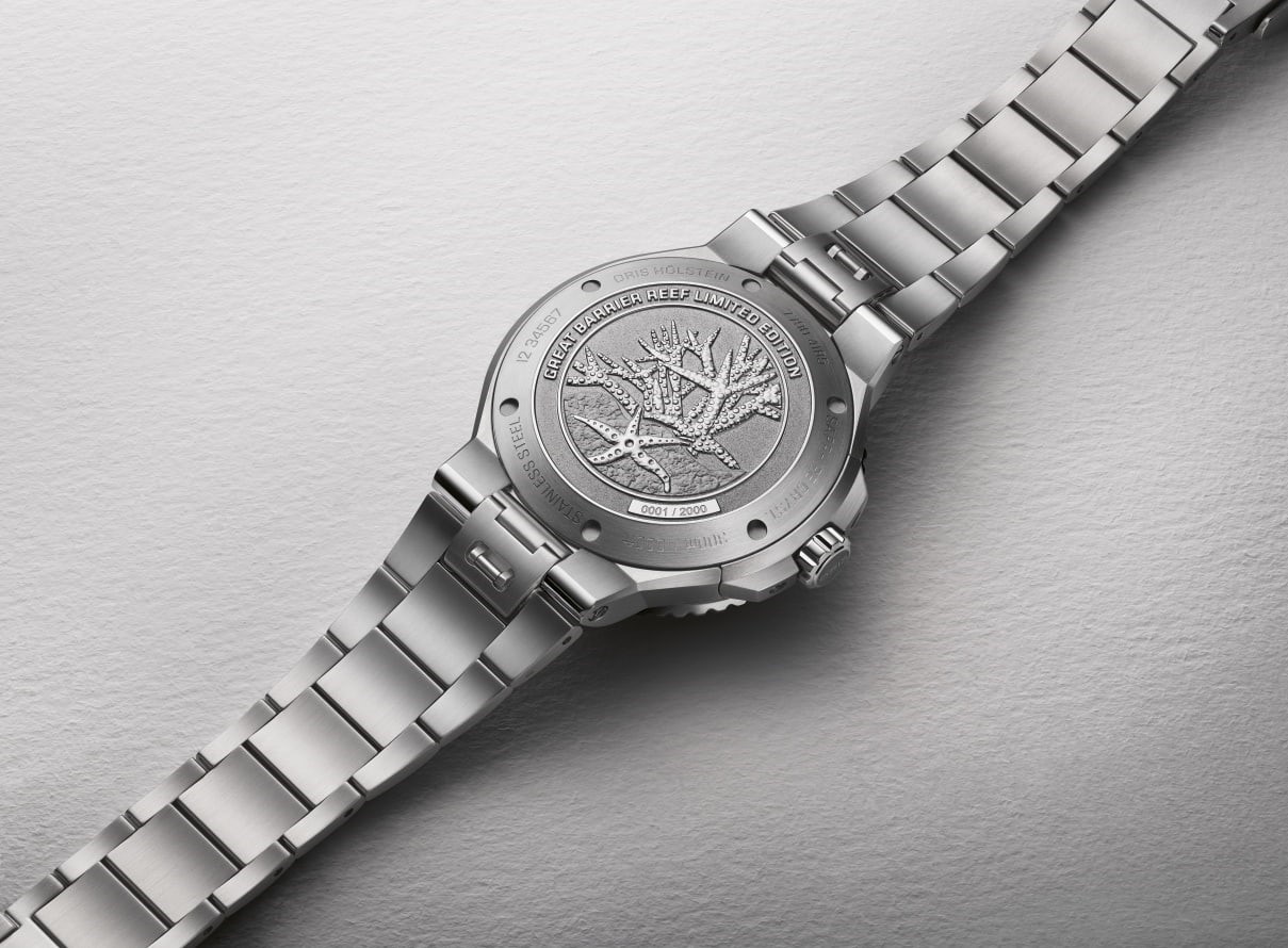 Oris Aquis Date Great Barrier Reef Limited Edition IV 01 400 7790 4185-Set to męski zegarek automatyczny na kombinacji szczotkowania i polerowania stalowej bransolety ze składanym zapięciem. Jest to limitowana edycja 2000 na całym świecie poświęcona Wielkiej Rafie Koralowej w Australii w ramach wsparcia Reef Restoration Foundation. Koperta ze stali nierdzewnej ma średnicę 43,5 milimetra, dekluę ozdobioną grawerem raf koralowych oraz jednokierunkowo obracający się bezel z wolframową wstawką ze skalą do nurkowania. Turkusowo-niebieska, gradientowa tarcza ze wskazaniem daty na godzinie szóstej jest chroniona trwałym szkłem szafirowym z powłoką antyrefleksyjną. Wskazówki, indeksy i część bezela pokryte są powłoką luminescencyjną Super-LumiNova®, która gwarantuje doskonałą czytelność w warunkach słabego oświetlenia. Zegarek napędzany jest manufakturowym mechanizmem Oris 400 z naciągiem automatycznym i ponadstandardową rezerwą chodu wynoszącą 5 dni. Mechanizm ma dwie sprężyny główne i brakuje mu tradycyjnego czerwony rotor, który odróżnia kaliber 400 od markowych modeli o regularnych mechanizmach. Oprócz pięciodniowej rezerwy chodu mechanizm oferuje również zwiększoną odporność na magnetyzm, czemu sprzyjają między innymi krzemowa armatura i koło krokowe. Oris zaleca okres międzyobsługowy dla tego mechanizmu wynoszący 10 lat, czyli dwukrotnie dłużej niż zalecany okres w przypadku zwykłych zegarków mechanicznych, a przede wszystkim tak bardzo wierzy w mechanizm, że daje na niego również 10-letnią gwarancję! To mechanizm z funkcją hakowania, który w razie potrzeby można również nakręcić ręcznie za pomocą sygnowanej zakręcanej koronki. Wodoodporność zegarka wynosi 30 ATM, co czyni go odpowiednim wyborem do snorkelingu i nurkowania.