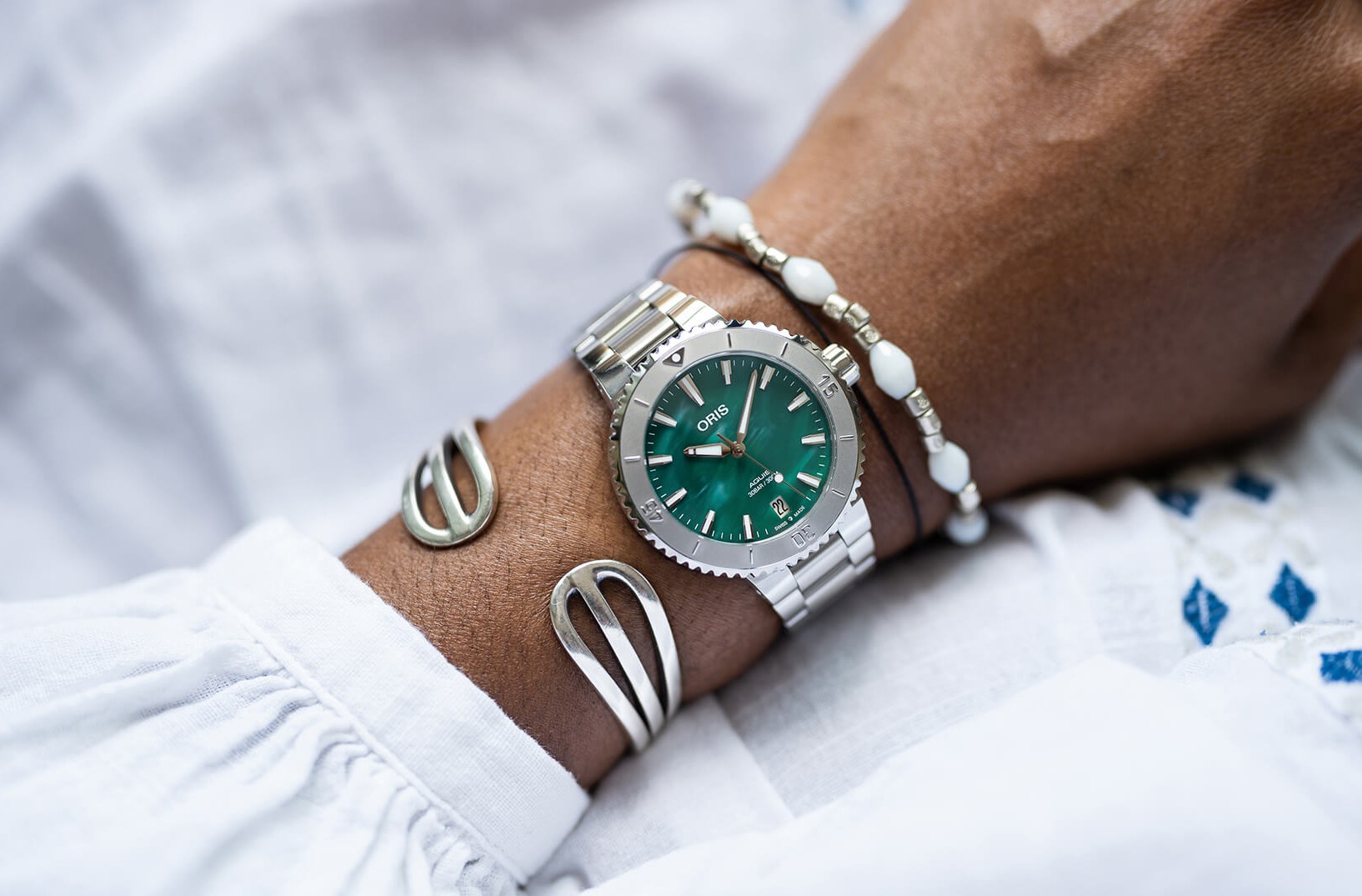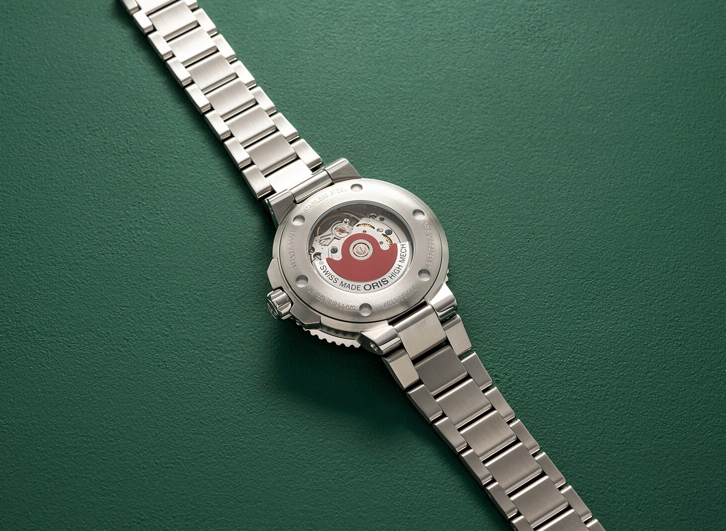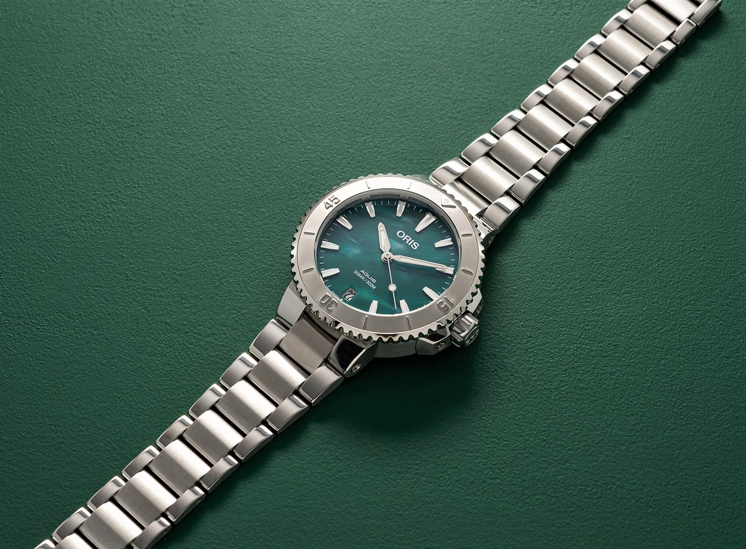 Oris Aquis x Bracenet 01 733 7770 4137-07 8 18 05P to damski zegarek automatyczny na stalowej bransolecie w połączeniu szlifu i połysku ze składanym zapięciem. Koperta ze stali nierdzewnej ma średnicę 36,5 milimetra, przezroczysty dekiel i jednokierunkowo obracający się bezel ze skalą do nurkowania. Zielona tarcza z datą i unikalną fakturą została wykonana z sieci rybackich pochodzących z recyklingu we współpracy z niemiecką firmą Bracenet. Chroni go trwałe szkło szafirowe z powłoką antyrefleksyjną. Wskazówki, indeksy i część bezela pokryte są powłoką luminescencyjną Super-LumiNova®, która gwarantuje doskonałą czytelność w warunkach słabego oświetlenia. Zegarek napędzany jest mechanizmem Oris 733 z naciągiem automatycznym i rezerwą chodu wynoszącą około 38 godzin. Bazą tego kalibru jest Sellita SW200-1. Mechanizm ten z funkcją hakowania można w razie potrzeby nakręcić także ręcznie za pomocą sygnowanej zakręcanej koronki. Wodoodporność zegarka wynosi 30 ATM, co czyni go odpowiednim wyborem do snorkelingu i nurkowania.