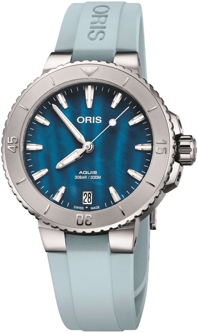 Oris Aquis Date 01 733 7770 4155-07 4 18 65FC to damski zegarek automatyczny na niebieskim gumowym pasku ze składanym zapięciem. Koperta ze stali nierdzewnej ma średnicę 36,5 milimetra, przezroczysty dekiel i jednokierunkowo obracający się bezel ze skalą do nurkowania. Niebieska tarcza z masy perłowej ze wskazaniem daty na godzinie szóstej jest chroniona trwałym szkłem szafirowym z powłoką antyrefleksyjną, a jej piękno uwydatnia się szczególnie w bezpośrednim świetle, kiedy możemy obserwować gra kolorów masy perłowej przypominająca taflę wody. Wskazówki, indeksy i część bezela pokryte są powłoką luminescencyjną Super-LumiNova®, która gwarantuje doskonałą czytelność w warunkach słabego oświetlenia. Zegarek napędzany jest mechanizmem Oris 733 z naciągiem automatycznym i rezerwą chodu wynoszącą około 38 godzin. Bazą tego kalibru jest Sellita SW200-1. Mechanizm ten z funkcją hakowania można w razie potrzeby nakręcić także ręcznie za pomocą sygnowanej zakręcanej koronki. Wodoodporność zegarka wynosi 30 ATM, co czyni go odpowiednim wyborem do snorkelingu i nurkowania.