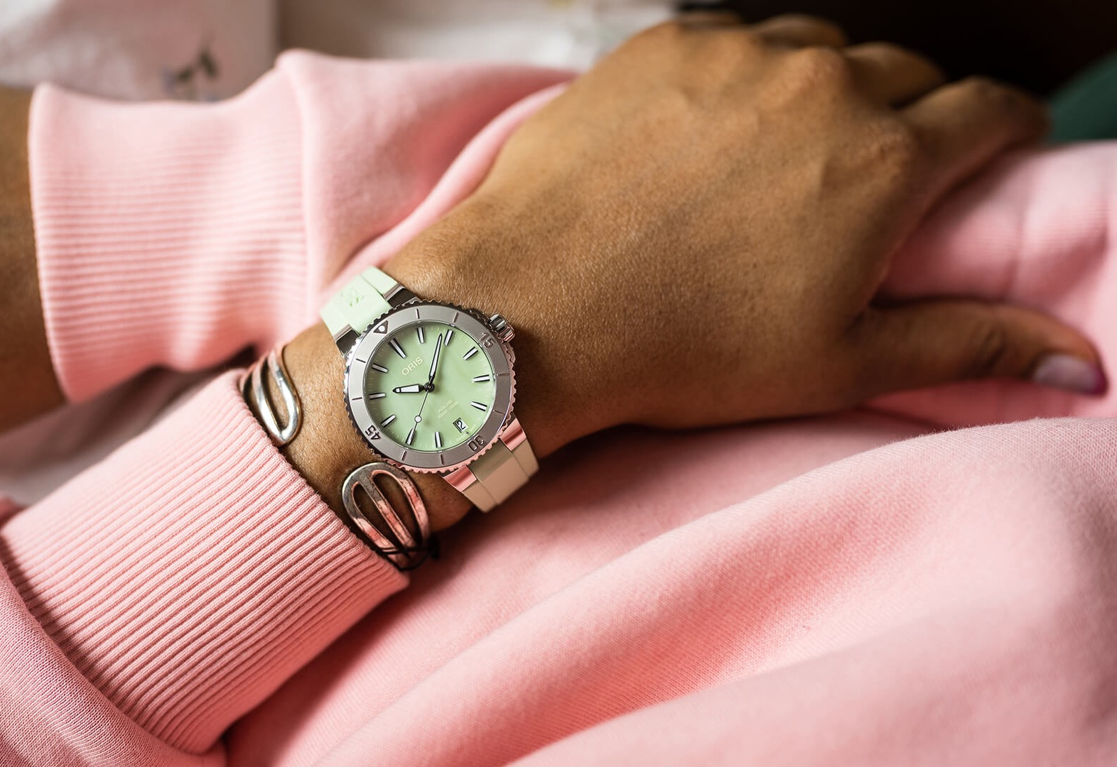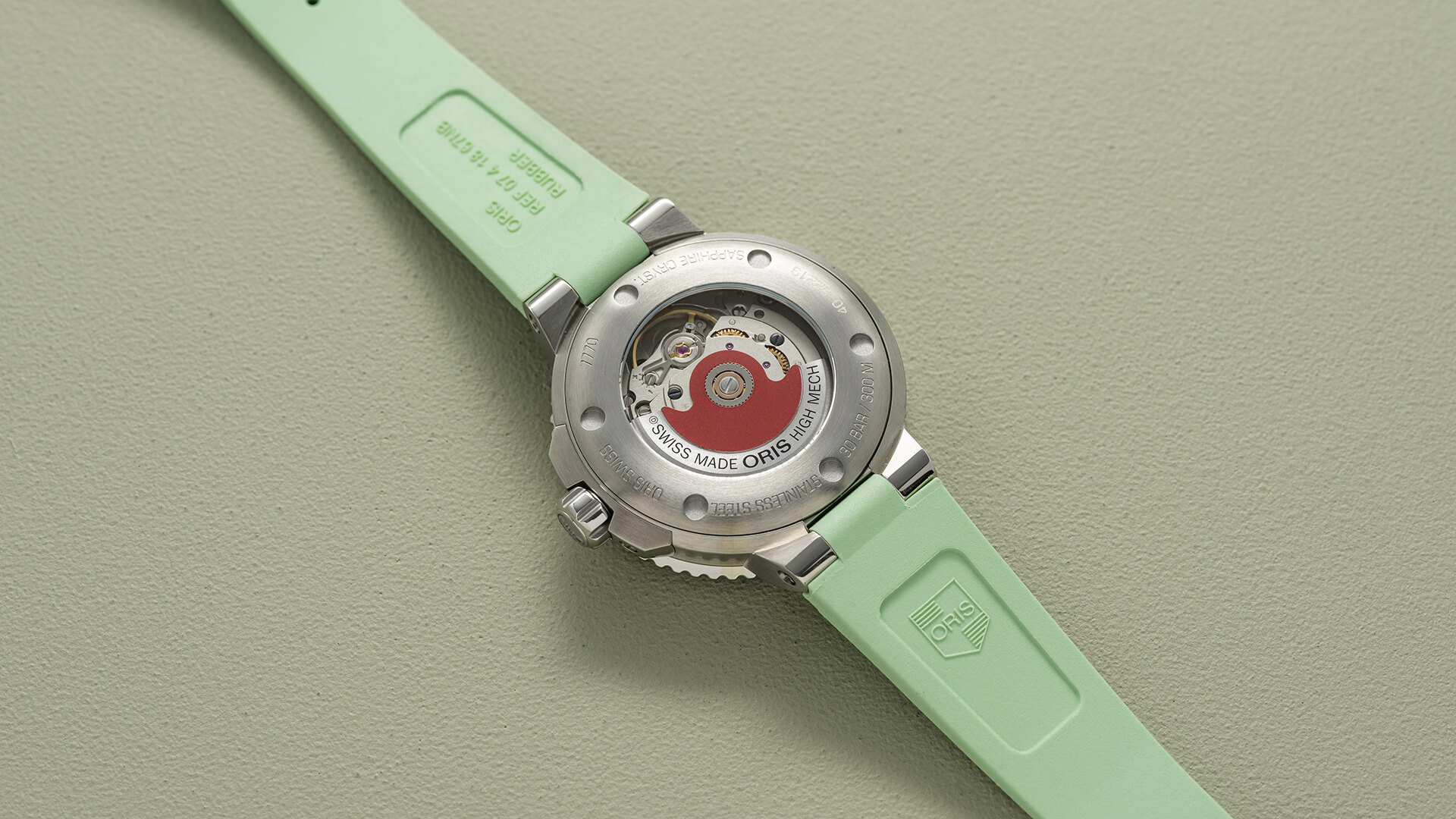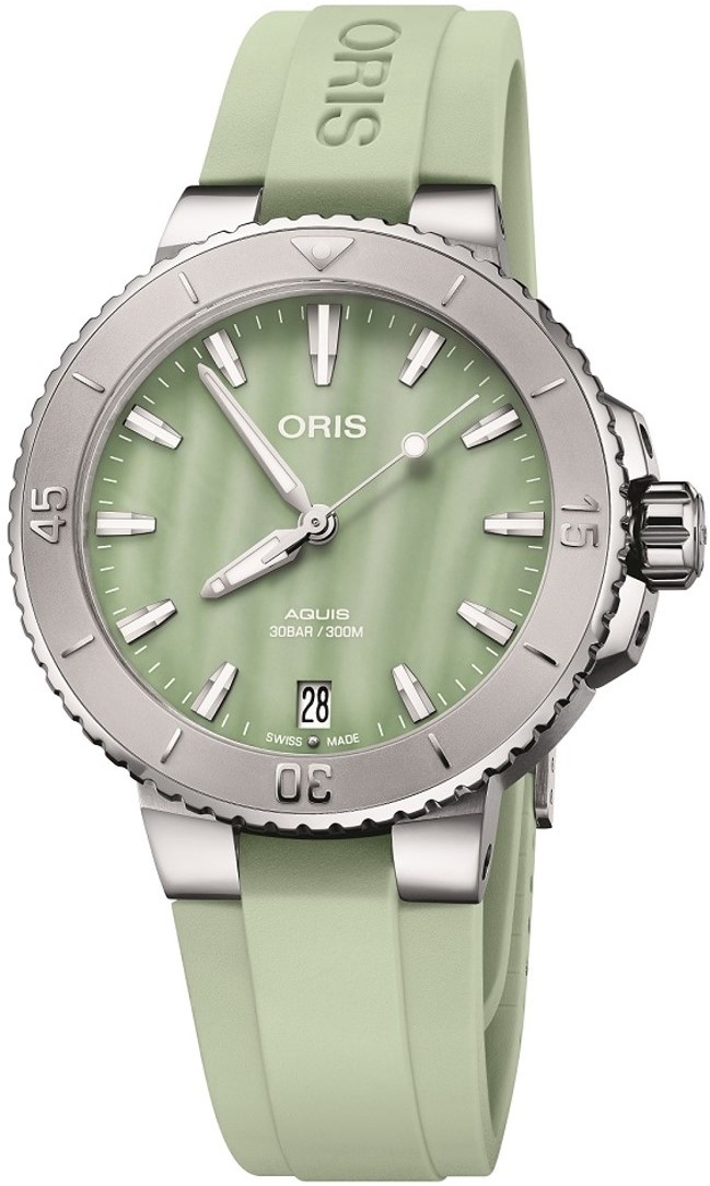 Oris Aquis Date 01 733 7770 4157-07 4 18 67FC to damski zegarek automatyczny na zielonym gumowym pasku ze składanym zapięciem. Koperta ze stali nierdzewnej ma średnicę 36,5 milimetra, przezroczysty dekiel i jednokierunkowo obracający się bezel ze skalą do nurkowania. Tarcza z zielonej masy perłowej ze wskazaniem daty na godzinie szóstej jest chroniona trwałym szkłem szafirowym z powłoką antyrefleksyjną, a jej piękno uwydatnia się szczególnie w bezpośrednim świetle, kiedy możemy obserwować grę o barwie masy perłowej podobnej do powierzchni wody. Wskazówki, indeksy i część bezela pokryte są powłoką luminescencyjną Super-LumiNova®, która gwarantuje doskonałą czytelność w warunkach słabego oświetlenia. Zegarek napędzany jest mechanizmem Oris 733 z naciągiem automatycznym i rezerwą chodu wynoszącą około 38 godzin. Bazą tego kalibru jest Sellita SW200-1. Mechanizm ten z funkcją hakowania można w razie potrzeby nakręcić także ręcznie za pomocą sygnowanej zakręcanej koronki. Wodoodporność zegarka wynosi 30 ATM, co czyni go odpowiednim wyborem do snorkelingu i nurkowania.