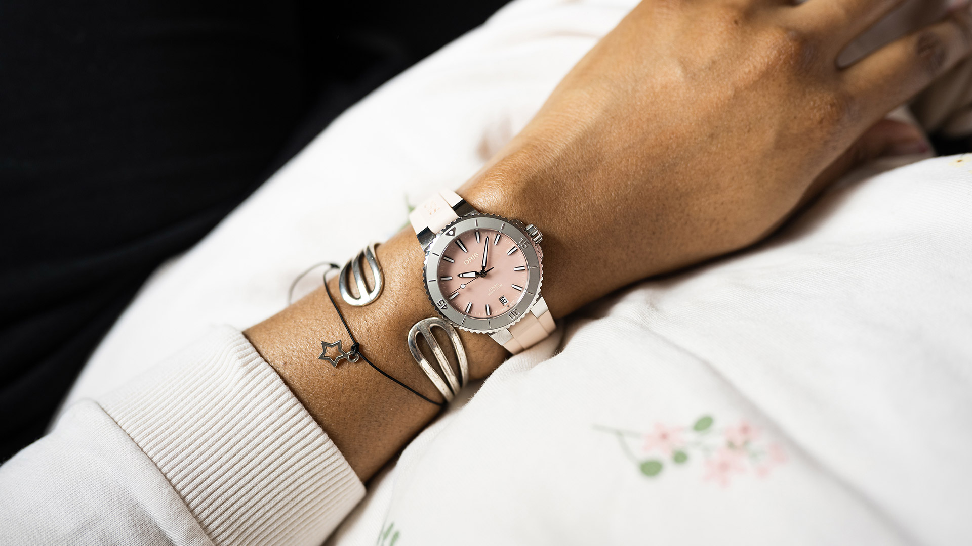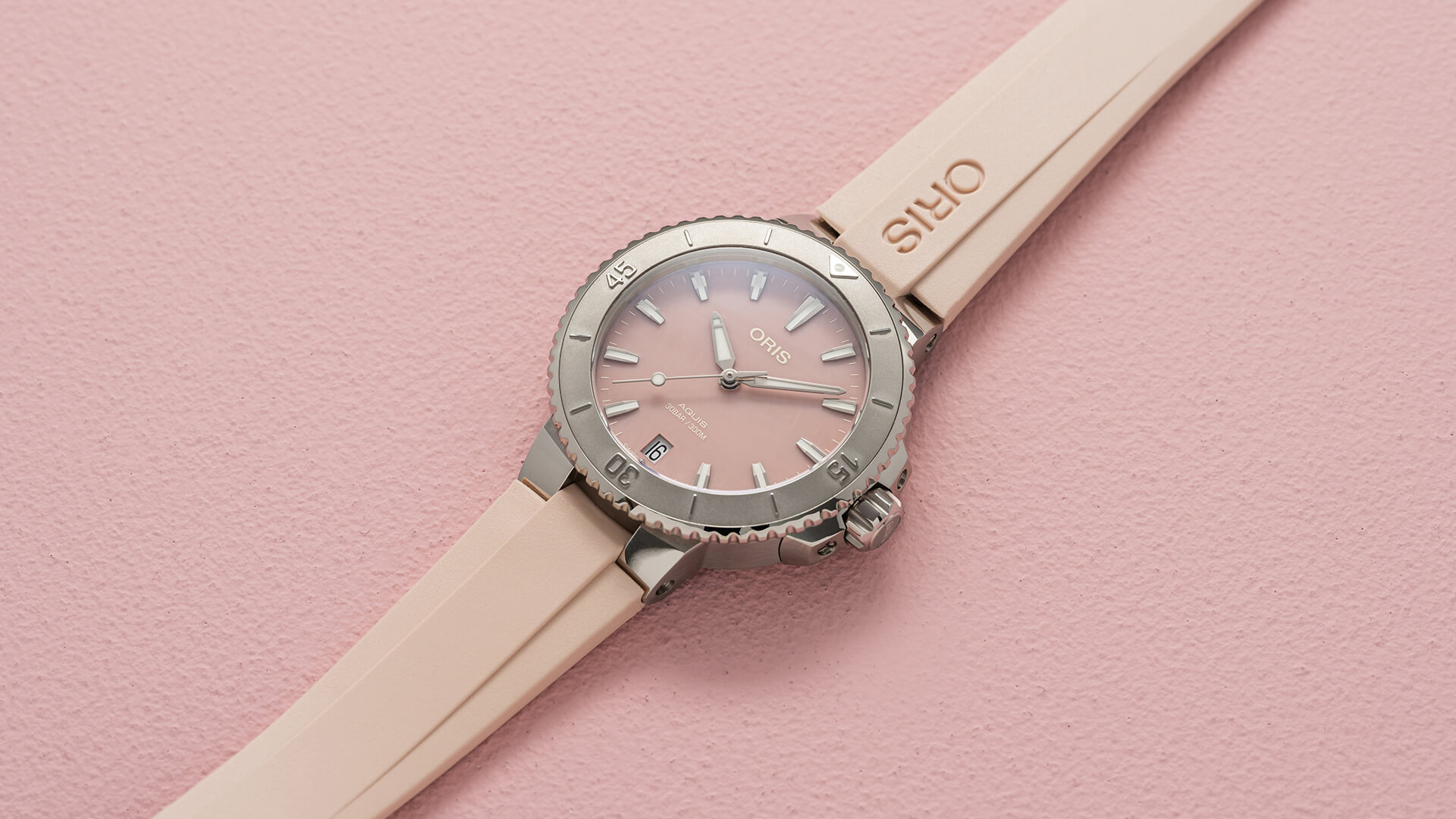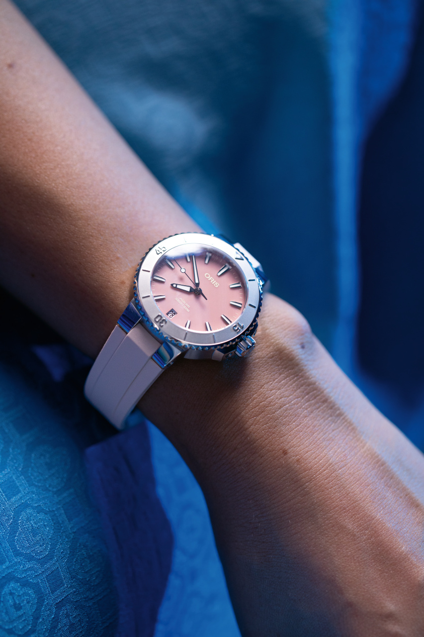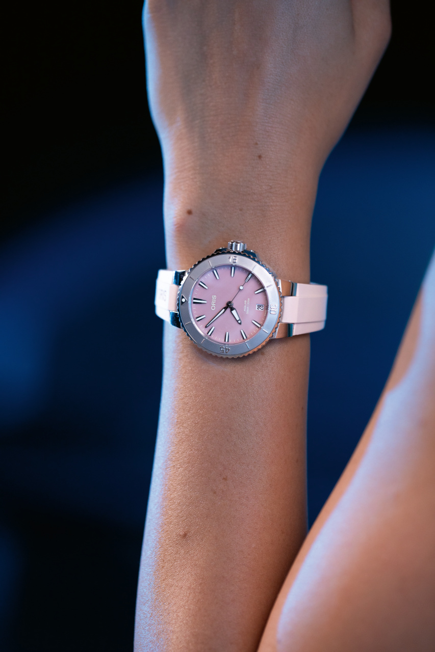 Oris Aquis Date 01 733 7770 4158-07 4 18 66FC to damski zegarek automatyczny na różowym gumowym pasku ze składanym zapięciem. Koperta ze stali nierdzewnej ma średnicę 36,5 milimetra, przezroczysty dekiel i jednokierunkowo obracający się bezel ze skalą do nurkowania. Różowa tarcza z masy perłowej ze wskazaniem daty na godzinie szóstej jest chroniona trwałym szkłem szafirowym z powłoką antyrefleksyjną, a jej piękno uwydatnia się szczególnie w bezpośrednim świetle, kiedy możemy obserwować gra kolorów masy perłowej przypominająca taflę wody. Wskazówki, indeksy i część bezela pokryte są powłoką luminescencyjną Super-LumiNova®, która gwarantuje doskonałą czytelność w warunkach słabego oświetlenia. Zegarek napędzany jest mechanizmem Oris 733 z naciągiem automatycznym i rezerwą chodu wynoszącą około 38 godzin. Bazą tego kalibru jest Sellita SW200-1. Mechanizm ten z funkcją hakowania można w razie potrzeby nakręcić także ręcznie za pomocą sygnowanej zakręcanej koronki. Wodoodporność zegarka wynosi 30 ATM, co czyni go odpowiednim wyborem do snorkelingu i nurkowania.