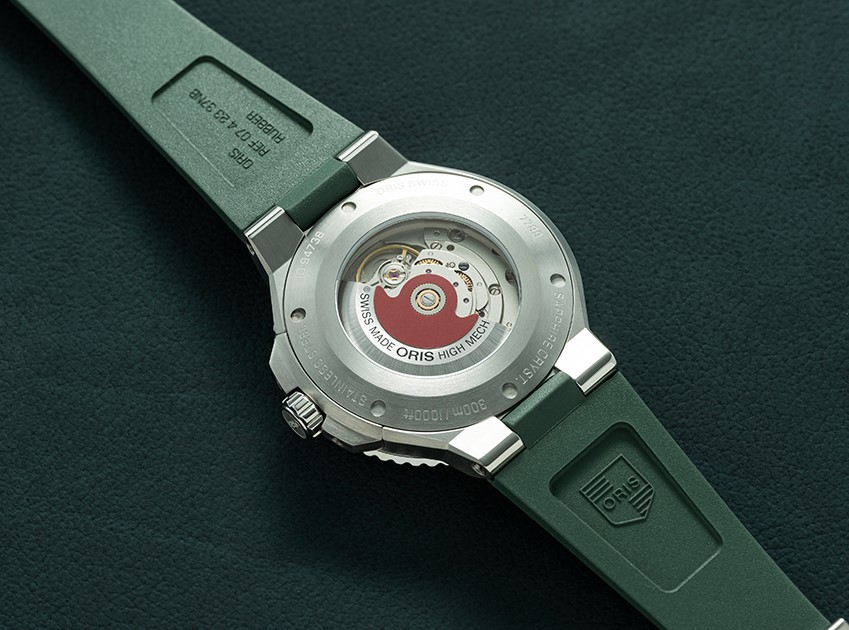 Oris Aquis Date 01 733 7789 4157-07 4 23 37FC to męski zegarek automatyczny na zielonym gumowym pasku ze składanym zapięciem. Koperta ze stali nierdzewnej ma średnicę 43,5 milimetra, przezroczysty dekiel i jednokierunkowo obracający się bezel z ceramiczną wkładką ze skalą do nurkowania. Zielona tarcza ze szlifem słonecznym i datownikiem na godzinie szóstej jest chroniona wytrzymałym szkłem szafirowym z powłoką antyrefleksyjną. Wskazówki, indeksy i część bezela pokryte są powłoką luminescencyjnąSuper-LumiNova®, która gwarantuje doskonałą czytelność w złych warunkach oświetleniowych. Zegarek napędzany jest mechanizmem Oris 733 z naciągiem automatycznym i rezerwą chodu wynoszącą około 38 godzin. Bazą tego kalibru jest Sellita SW200-1. Ten mechanizm z funkcją hakowania można w razie potrzeby nakręcić także ręcznie, korzystając z sygnowanej zakręcanej koronki. Wodoodporność zegarka wynosi 30 ATM, co czyni go odpowiednim wyborem do snorkelingu i nurkowania.