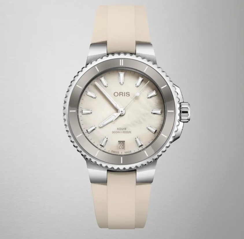 Oris Aquis Date 01 733 7792 4151-07 4 19 61FC to damski zegarek automatyczny na beżowym gumowym pasku ze składanym zapięciem. Koperta ze stali nierdzewnej ma średnicę 36,5 milimetra, przezroczysty dekiel i jednokierunkowo obracający się bezel z ceramiczną wkładką ze skalą minutową. Biała tarcza z masy perłowej ze wskazaniem daty na godzinie szóstej jest chroniona trwałym szkłem szafirowym z powłoką antyrefleksyjną, a jej piękno uwydatnia się szczególnie w bezpośrednim świetle, kiedy możemy obserwować gra kolorów masy perłowej. Zastosowane indeksy godzinowe wraz ze wskazówkami pokryte są powłoką luminescencyjną Super-LumiNova®, która gwarantuje doskonałą czytelność w warunkach słabego oświetlenia. Zegarek napędzany jest mechanizmem Oris 733 z naciągiem automatycznym i rezerwą chodu wynoszącą około 38 godzin. Bazą tego kalibru jest Sellita SW200-1. Mechanizm ten z funkcją hakowania można w razie potrzeby nakręcić także ręcznie za pomocą sygnowanej zakręcanej koronki. Wodoodporność zegarka wynosi 30 ATM, co czyni go odpowiednim wyborem do snorkelingu i nurkowania.