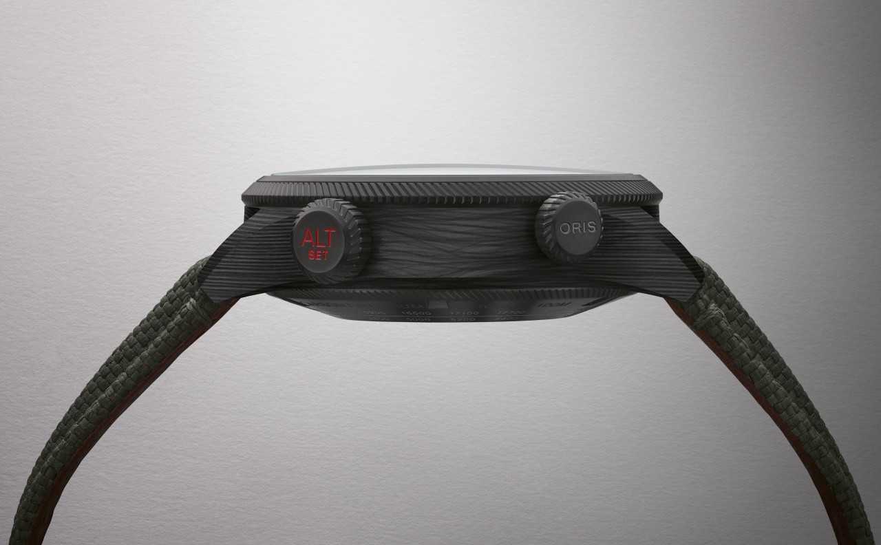 Oris ProPilot Altimeter z kopertą z włókna węglowego i mechanicznym wysokościomierzem, skala w stopach.