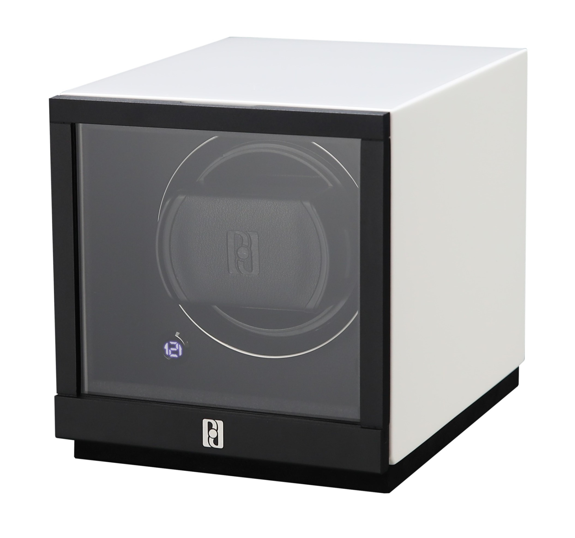 Nakręcacz do zegarków firmy Paul Design na jeden zegarek. Ręcznie robiona drewniana skrzynka w białym połysku ze szklanymi drzwiami na zawiasach charakteryzuje się cichą pracą, oświetleniem LED i sterowaniem dotykowym.