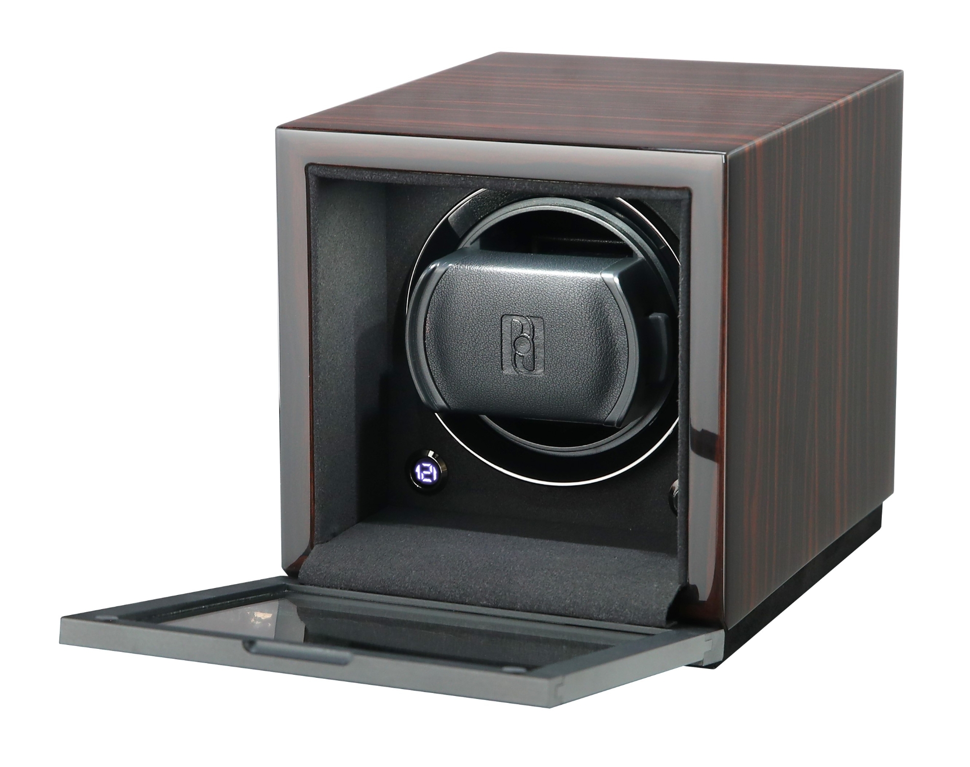 Nakręcacz do zegarków firmy Paul Design na jeden zegarek. Ręcznie robione drewniane pudełko ze szklanymi drzwiami na zawiasach charakteryzuje się cichą pracą, oświetleniem LED i sterowaniem dotykowym.