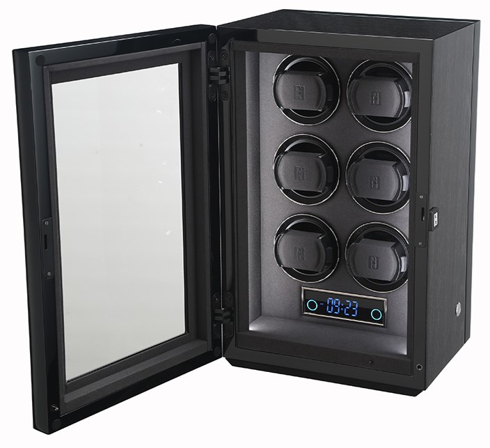 Nakręcacz do zegarków firmy Paul Design na sześć zegarków ze sterowaniem dotykowym. Ręcznie robione pudełko zostało zaprojektowane w kolorze Black Apricot i jest wyposażone w podświetlenie LED.
