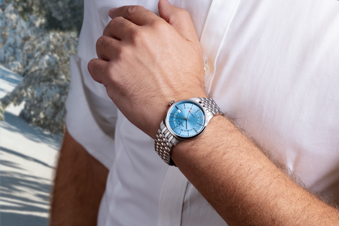 Model wyposażony jest w dodatkową centralną wskazówkę GMT oraz 24-godzinny pierścień na tarczy, co umożliwia intuicyjne śledzenie czasu w dwóch różnych lokalizacjach jednocześnie. Czysty, minimalistyczny design i eleganckie wykończenie sprawiają, że zegarek doskonale prezentuje się zarówno z garniturem, jak i w swobodniejszym wydaniu.
