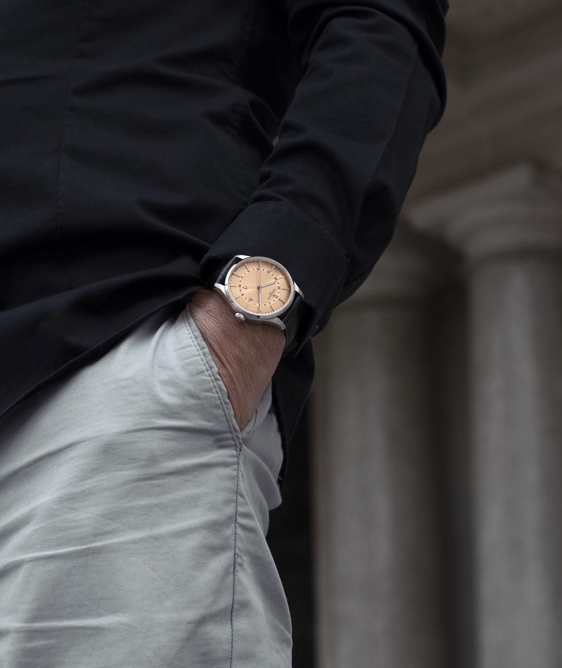 Model wyposażony jest w dodatkową centralną wskazówkę GMT oraz 24-godzinny pierścień na tarczy, co umożliwia intuicyjne śledzenie czasu w dwóch różnych lokalizacjach jednocześnie. Czysty, minimalistyczny design i eleganckie wykończenie sprawiają, że zegarek doskonale prezentuje się zarówno z garniturem, jak i w swobodniejszym wydaniu.