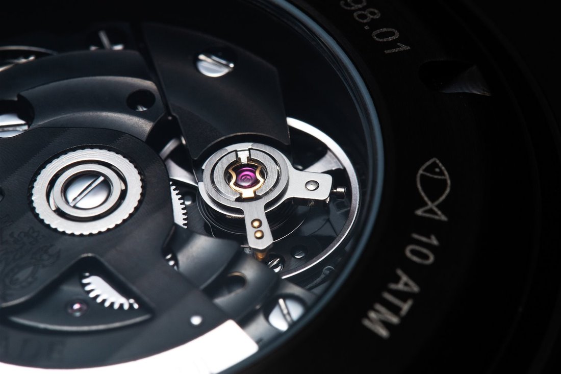 Kolejną specjalnością konstrukcyjną jest czarna tarcza z ciemnoszarymi podświetlanymi indeksami. Przezroczysta tylna pokrywa zegarka umożliwia podgląd mechanizmu. Wodoodporność 10 ATM pozwala na uniwersalne zastosowanie we wszystkich normalnych codziennych czynnościach.