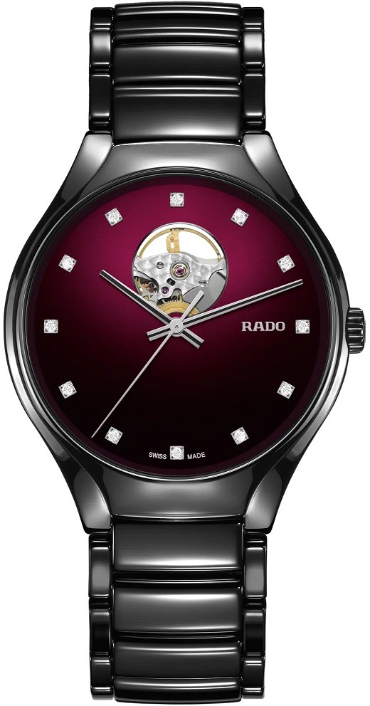 Elegancki zegarek True Open Heart Automatic stanowi ucieleśnienie DNA marki Rado z rewolucyjną, monoblokową, okrągłą kopertą wykonaną z ceramiki High-Tech i widokiem „otwartego serca” na tarczy, który pozwala obserwować wewnętrzny mechanizm zegarka.