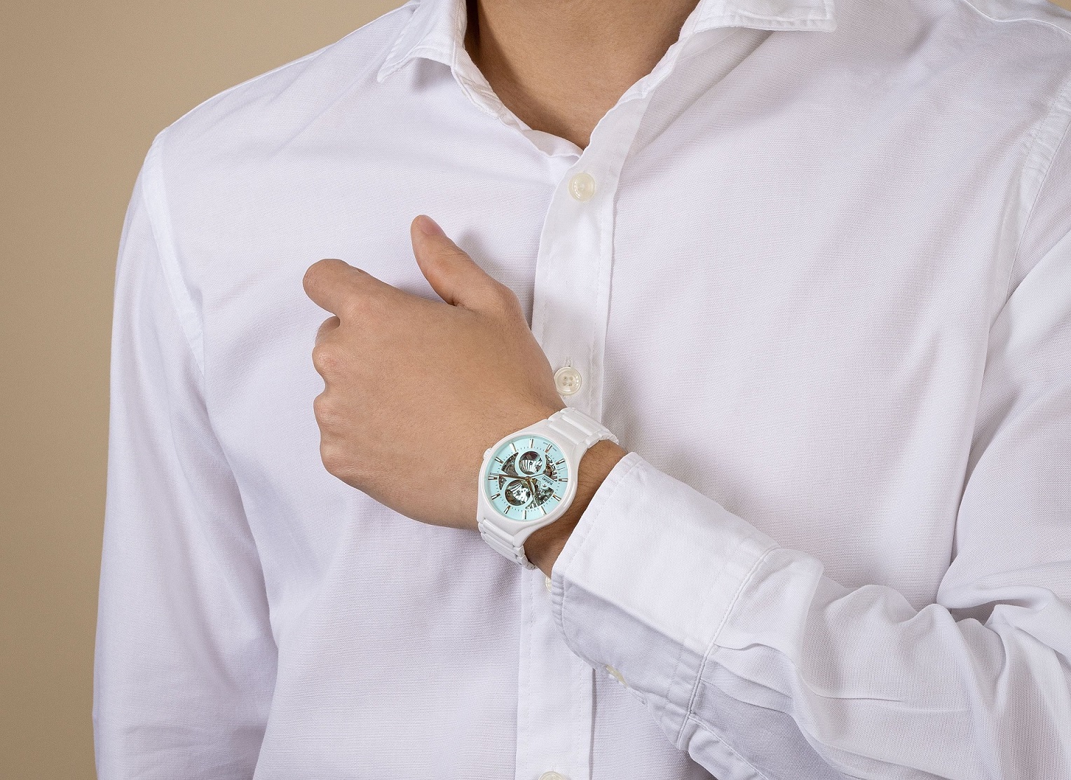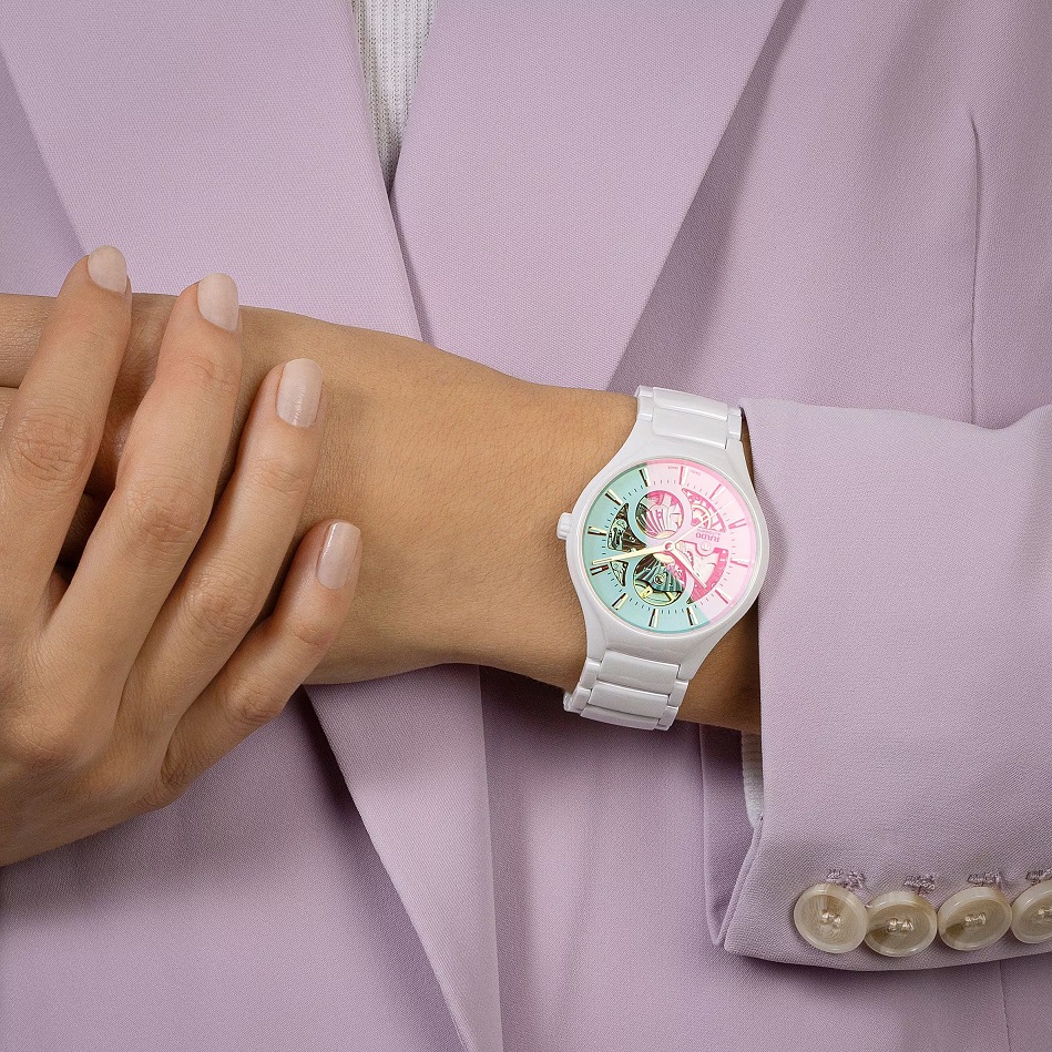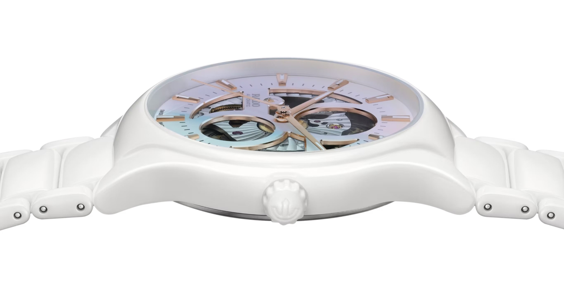 Elegancki zegarek True Open Heart Automatic stanowi ucieleśnienie DNA marki Rado z rewolucyjną, monoblokową, okrągłą kopertą wykonaną z ceramiki High-Tech i widokiem „otwartego serca” na tarczy, który pozwala obserwować wewnętrzny mechanizm zegarka.