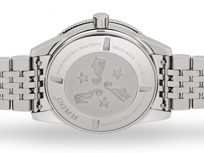 Rado Captain Cook R32505203 to męski zegarek nurkowy na metalowej bransolecie typu „beads of rice”, która zawdzięcza swoją nazwę temu, że jej centralne części przypominają ziarenka ryżu. Polerowana koperta ze stali nierdzewnej ma średnicę 42 milimetrów i jednokierunkowo obrotowy bezel z niebieską ceramiczną wkładką wykonaną z ceramiki High-Tech. Niebieską tarczę z efektem słonecznym i okienkiem daty na godzinie 3 chroni wypukłe szafirowe szkłoszkło z dwustronną powłoką antyrefleksyjną. Nakładane indeksy godzinowe, podobnie jak wskazówki, pokryte są powłoką luminescencyjną Super-LumiNova®, która gwarantuje doskonałą czytelność w warunkach słabego oświetlenia.