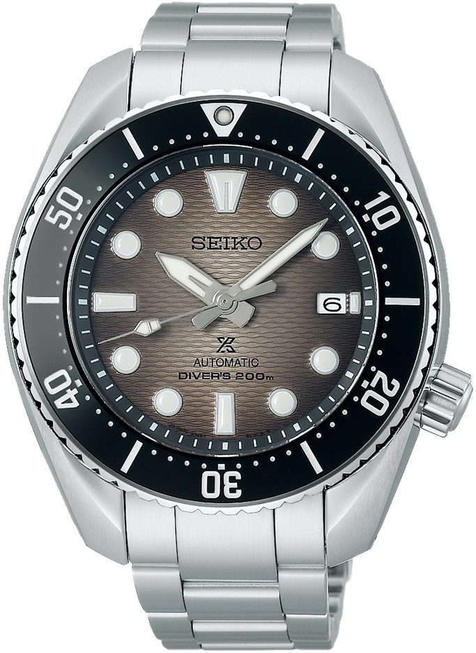 Męski zegarek automatyczny Seiko Prospex King Sumo Diver SPB323J1 na metalowej bransolecie ze składanym zapięciem i blokadą zwalniającą za pomocą przycisku. Zapięcie zawiera przedłużkę bransolety, co jest szczególnie praktyczne w przypadku nurkowania. Koperta ze stali nierdzewnej w połączeniu szczotkowania i polerowania ma średnicę 45 milimetrów i jednokierunkowo obracający się bezel z ceramiczną wkładką ze skalą nurkową. Wśród fanów ten kształt obudowy jest również znany jako „Sumo”. Tarcza ze wskazaniem daty o gradientowo-szarej fakturze jest chroniona trwałym szkłem szafirowym z powłoką antyrefleksyjną. Zastosowane indeksy godzinowe oraz wskazówki i bezel pokryte są powłoką luminescencyjną LumiBrite, która gwarantuje doskonałą czytelność w warunkach słabego oświetlenia. Zegarek napędzany jest mechanizmem 6R35 z naciągiem automatycznym i rezerwą chodu wynoszącą około 70 godzin. Ten manufakturowy mechanizm z funkcją hakowania można w razie potrzeby nakręcić również ręcznie za pomocą zakręcanej koronki. Wodoodporność zegarka wynosi 20 ATM, a dzięki certyfikatowi ISO 6425 jest to odpowiedni wybór do nurkowania według wskazań przyrządów.