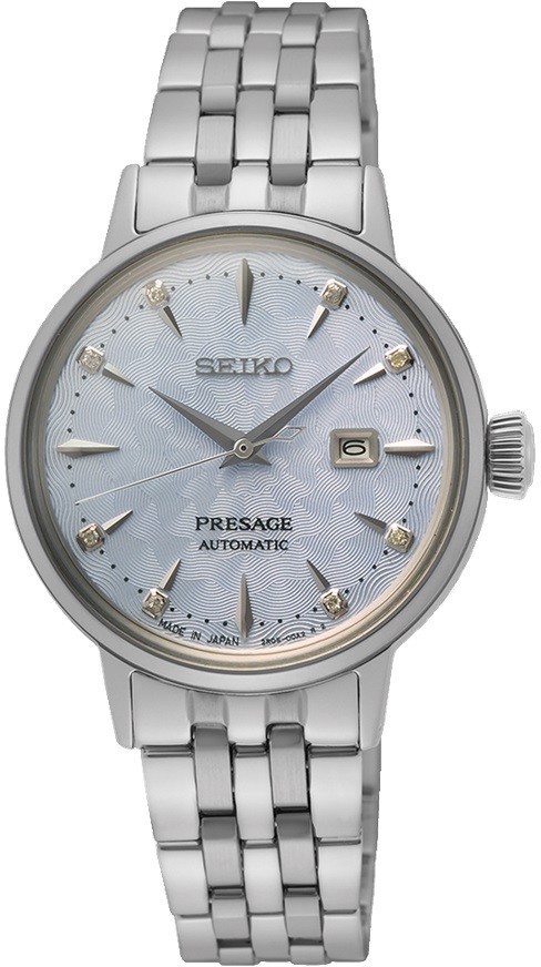 Damski automatyczny zegarek Seiko Presage Cocktail Time Skydiving SRE007J1 na metalowej pięciorzędowej bransolecie w połączeniu szczotkowania i polerowania ze składanym zapięciem. Koperta ze stali nierdzewnej ma średnicę 30,3 milimetra. Niebieska tarcza o lekkiej fakturze przypominającej piankę świeżo przygotowanego napoju w połączeniu z zakrzywionym szkłem Hardlex tworzy przyciągający wzrok efekt, dzięki któremu zegarek w ciekawy sposób bawi się światłem. Model inspirowany jest koktajlem Skydiving i wyposażony jest w pogrubione indeksy godzin z diamentami. Zegarek napędzany jest mechanizmem 2R05 z naciągiem automatycznym i rezerwą chodu wynoszącą około 40 godzin. Ten manufakturowy mechanizm z funkcją hakowania można w razie potrzeby nakręcić również ręcznie za pomocą sygnowanej koronki. Wodoodporność zegarka wynosi 5 ATM, dzięki któremu jest odporny na zachlapania i zachlapania i opady.