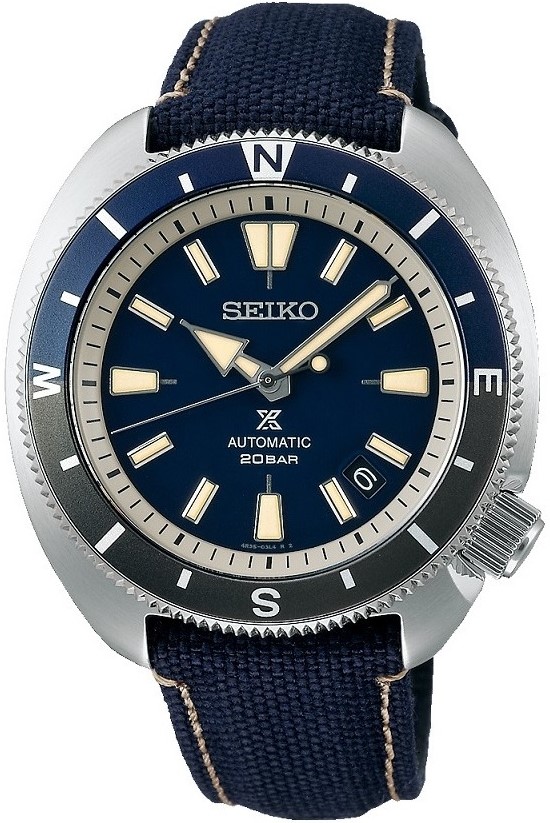 Męski zegarek automatyczny Seiko Prospex Tortoise Land Edition SRPG15K1 na niebieskim tekstylnym pasku z beżowymi przeszyciami i sprzączką. Koperta ze stali nierdzewnej o typowym kształcie w kształcie szylkretu z połączeniem szczotkowania i polerowania ma średnicę 42,4 milimetra i dwukierunkową obrotową bezel kompasu z aluminiową wkładką. Niebieska tarcza ze wskazaniem daty chroni trwałe szkło szafirowe. Zastosowane indeksy godzinowe, podobnie jak wskazówki, pokryte są kremową powłoką luminescencyjną LumiBrite, która gwarantuje doskonałą czytelność w warunkach słabego oświetlenia. Zegarek napędzany jest mechanizmem 4R35 z naciągiem automatycznym i rezerwą chodu wynoszącą około 41 godzin. Ten manufakturowy mechanizm z funkcją hakowania można w razie potrzeby nakręcić również ręcznie za pomocą zakręcanej koronki. Wodoodporność zegarka wynosi 20 ATM i dlatego jest odpowiednim wyborem do pływania, snorkelingu, ale także głębokiego nurkowania do ok. 50 metrów.