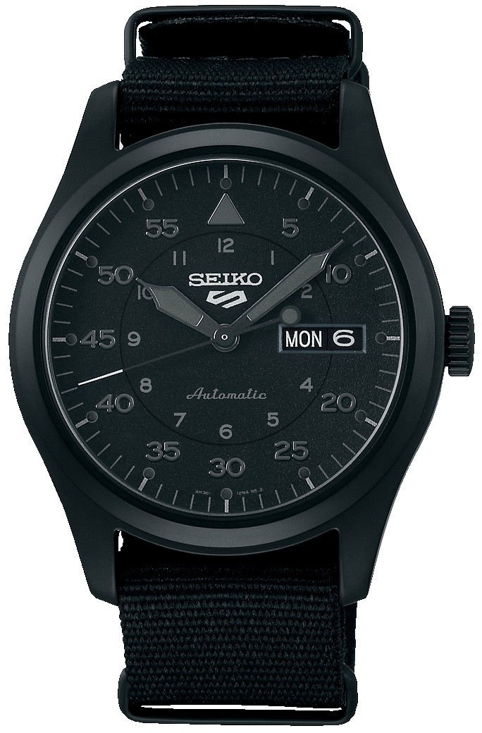 Męski automatyczny zegarek pilota Seiko 5 Sports Stealth SRPJ11K1 na pasku NATO ze sprzączką. Zegarek jest monochromatyczny, co nadaje mu bardzo dyskretny wygląd. Tylko logo Seiko 5, dzień, data i koniec wskazówki sekundowej są w kolorze białym. Koperta ze stali nierdzewnej pokrytej metodą PVD ma średnicę 39,4 milimetra i przezroczysty dekiel. Czarna tarcza ze wskazaniem dnia i daty jest w tym modelu typu B-Muster, czyli z preferowaną skalą minutową. Tarczę zegarka pokryto wytrzymałym szkłem Hardlex. Zastosowane indeksy godzinowe, podobnie jak wskazówki, pokryte są czarną luminescencyjną powłoką LumiBrite, która gwarantuje doskonałą czytelność w warunkach słabego oświetlenia. Zegarek napędzany jest mechanicznym mechanizmem 4R36 z naciągiem automatycznym i rezerwą chodu wynoszącą około 41 godzin. Ten manufakturowy mechanizm z funkcją hakowania można w razie potrzeby nakręcić również ręcznie za pomocą koronki. Wodoodporność zegarka wynosi 10 ATM i dlatego nadaje się do pływania i snorkelingu.