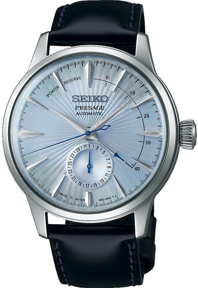 Seiko Presage Cocktail Time Skydiving SSA343J1 Męski automatyczny zegarek na skórzanym pasku ze składanym zapięciem. Koperta ze stali nierdzewnej w połączeniu szczotkowania i polerowania ma średnicę 40,5 milimetra i przezroczysty dekiel. Teksturowana niebieska tarcza ze wskazaniem daty i rezerwy chodu w połączeniu z zakrzywionym szkłem Hardlex tworzy przyciągający wzrok efekt, dzięki któremu zegarek w ciekawy sposób bawi się światłem. Model inspirowany jest koktajlem spadochronowym i charakteryzuje się odważnymi zastosowanymi indeksami godzin w połączeniu z niebieską wskazówką sekundową, a także wskazówkami daty i rezerwy chodu. Zegarek napędzany jest mechanizmem 4R57 z naciągiem automatycznym i rezerwą chodu wynoszącą około 41 godzin. Ten manufakturowy mechanizm z funkcją hakowania można w razie potrzeby nakręcić również ręcznie za pomocą sygnowanej koronki. Wodoodporność tego eleganckiego zegarka wynosi 5 ATM, dzięki któremu jest odporny na zachlapania i zachlapania i opady.
