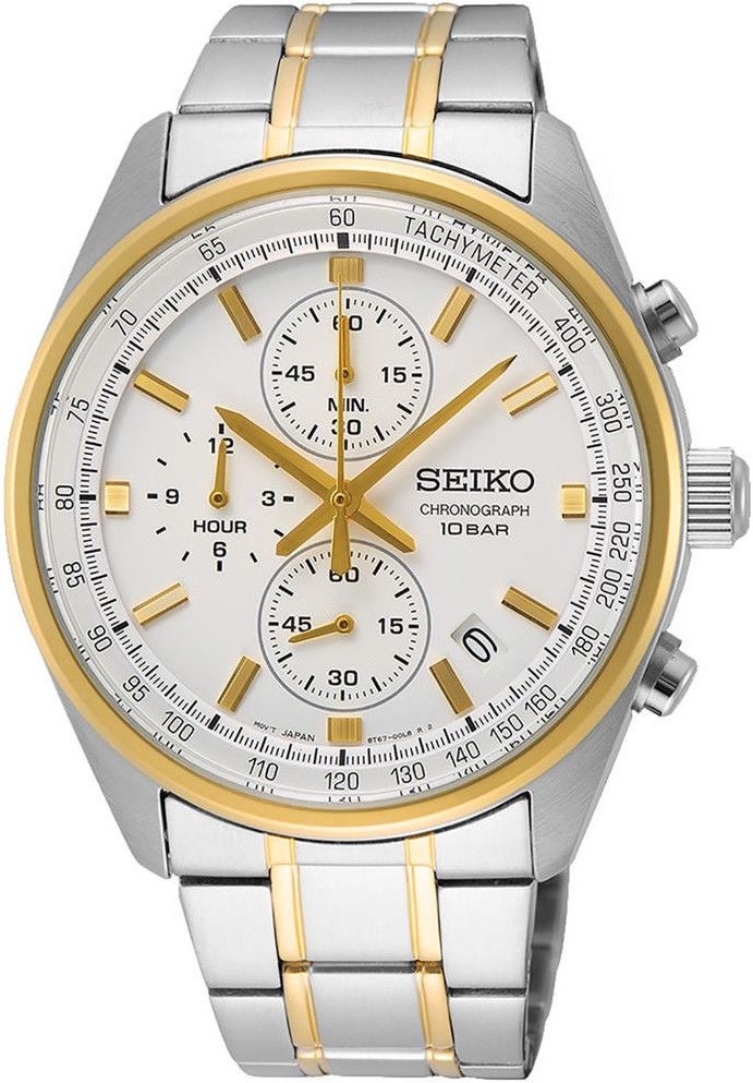 Męski zegarek na baterie Seiko Quartz Chronograph SSB380P1 na metalowej dwukolorowej bransolecie ze składanym zapięciem. Koperta wykonana ze stali nierdzewnej poddanej obróbce szlifowania i polerowania, uzupełniona ramką zewnętrzną z powłoką PVD w kolorze złota, ma średnicę 41,5 milimetra. Biała tarcza ze wskazaniem daty i funkcją chronografu jest chroniona wytrzymałym szkłem Hardlex. Zastosowane indeksy godzinowe, podobnie jak wskazówki, ukazane są w kontrastowym złotym kolorze, co poprawia czytelność zegarka. Zegarek wyposażony jest w wewnętrzną bezel z funkcją tachymetru, którego można używać w połączeniu ze stoperem do pomiaru prędkości poruszających się obiektów. Zegarek napędza niezawodny mechanizm kwarcowy 8T67. Wodoodporność zegarka wynosi 10 ATM i dlatego nadaje się do pływania i snorkelingu.