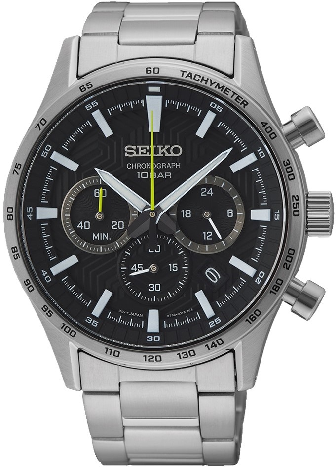 Męski zegarek kwarcowy Seiko Quartz SSB413P1 na metalowej bransolecie ze składanym zapięciem. Koperta ze stali nierdzewnej z kombinacją szczotkowanego i błyszczącego wykończenia ma średnicę 43 milimetrów i nieruchomą lunetę z funkcją tachymetru, którą można wykorzystać w połączeniu z funkcją chronografu do pomiaru prędkości poruszających się obiektów. Czarna teksturowana tarcza z datownikiem i funkcją chronografu jest chroniona trwałym szkłem szafirowym. Białe indeksy godzin, podobnie jak wskazówki, pokryte są powłoką luminescencyjną LumiBrite, która gwarantuje doskonałą czytelność w warunkach słabego oświetlenia. Zegarek napędzany jest niezawodnym mechanizmem kwarcowym 8T63. Wodoodporność zegarka wynosi 10 ATM, dlatego nadaje się do pływania i snorkelingu.