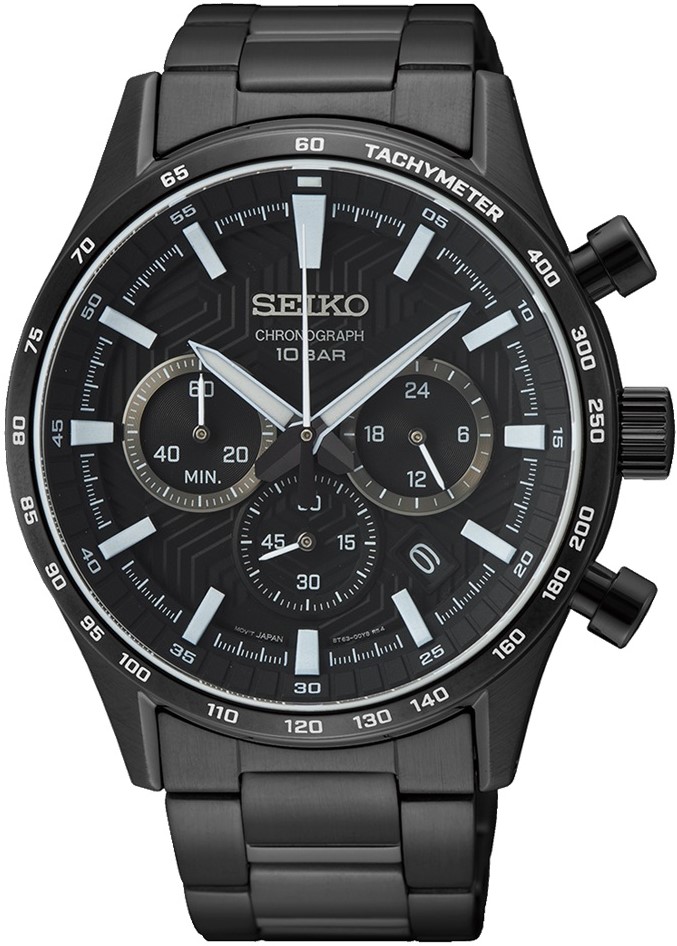 Męski zegarek na baterie Seiko Quartz SSB415P1 na metalowej bransolecie z wykończeniem PVD w kolorze czarnym i składanym zapięciem. Koperta ze stali nierdzewnej ma średnicę 43 milimetrów i nieobrotowy bezel z funkcją tachometru, którego można używać w połączeniu z funkcją stopera do pomiaru prędkości poruszających się obiektów. Czarna teksturowana tarcza z datownikiem i funkcją chronografu jest chroniona trwałym szkłem szafirowym. Białe indeksy godzin, podobnie jak wskazówki, pokryte są powłoką luminescencyjną LumiBrite, która gwarantuje doskonałą czytelność w warunkach słabego oświetlenia. Zegarek napędzany jest niezawodnym mechanizmem kwarcowym 8T63. Wodoodporność zegarka wynosi 10 ATM i dlatego nadaje się do pływania i snorkelingu.