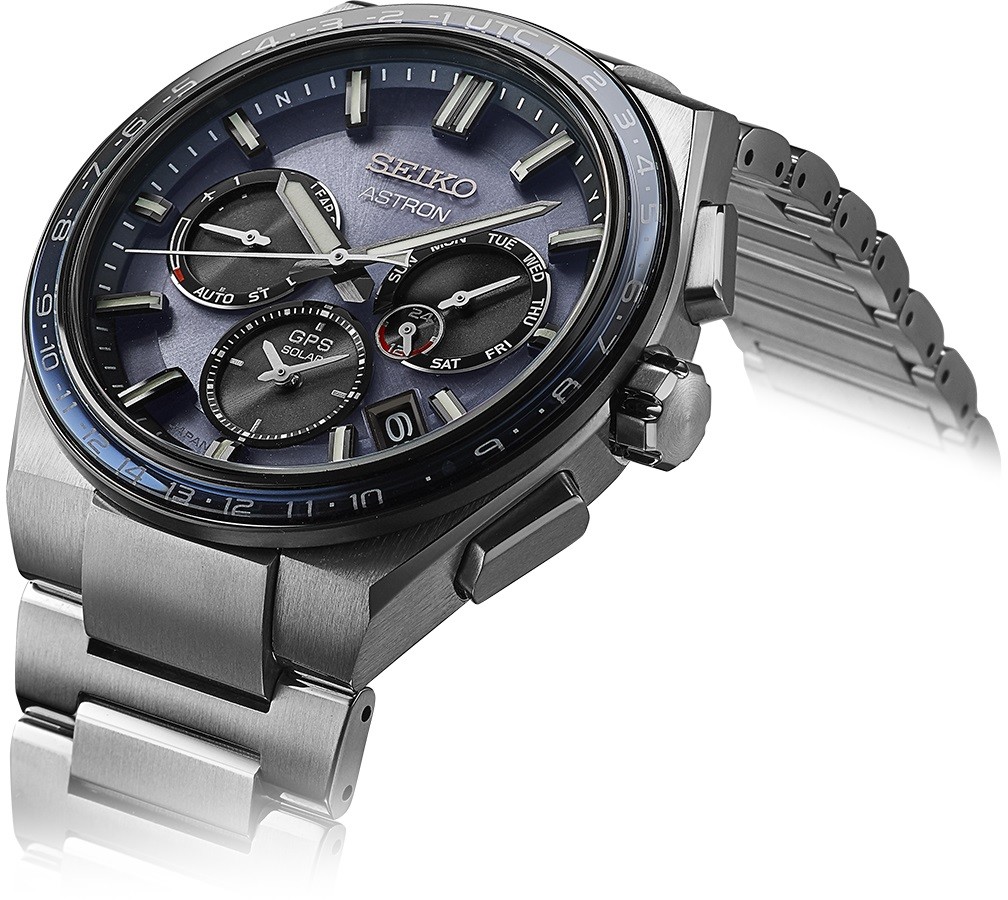 Męski zegarek solarny Seiko Astron GPS Solar 5X53 Dual-Time SSH109J1 na zintegrowanej tytanowej bransolecie ze składanym zapięciem z mikroregulacją jest następcą modelu Astron wprowadzonego w 1969 roku. Tytanowa koperta łączy w sobie mat i połysk Średnica 42,7 milimetra i bezel z ceramicznym wkładem z naniesionymi strefami czasowymi. Ciemnoniebieska tarcza zabezpieczona szkłem szafirowym z powłoką antyrefleksyjnąwskazuje datę i dzień tygodnia (kalendarz wieczny), stan naładowania baterii, godzinę i podwójny czas . Zastosowane indeksy godzinowe, podobnie jak wskazówki, pokryte są powłoką luminescencyjną LumiBrite, która gwarantuje doskonałą czytelność w warunkach słabego oświetlenia. Zegarek zasilany jest mechanizmem słonecznym baterii 5X53 z zabezpieczeniem przed przeładowaniem i funkcją oszczędzania energii. Zegarek odbiera sygnał GPS w celu automatycznego ustawienia czasu i strefy czasowej. Wodoodporność zegarka wynosi 10 ATM i dlatego nadaje się do pływania i snorkelingu.