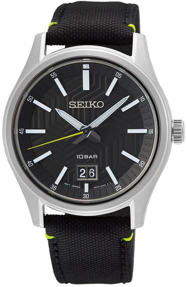 Męski zegarek kwarcowy Seiko Quartz SUR517P1 na czarnym tekstylnym pasku ze skórzaną wyściółką i zapinaną klamrą. Koperta ze stali nierdzewnej ma średnicę 39,5 mm. Czarna teksturowana tarcza z datownikiem w stylu big date jest chroniona trwałym szkłem szafirowym. Zastosowane indeksy godzinowe oraz wskazówki pokryte są powłoką luminescencyjną LumiBrite, która gwarantuje doskonałą czytelność w warunkach słabego oświetlenia. Wskazówka sekundowa w kontrastowym kolorze limonkowo-zielonym komponuje się ze szwami na pasku. Zegarek napędza niezawodny mechanizm kwarcowy 6N76. Wodoodporność zegarka wynosi 10 ATM i dlatego nadaje się do pływania i snorkelingu.