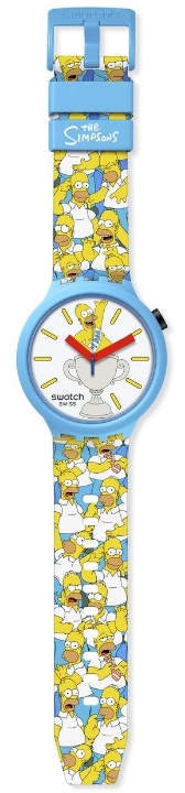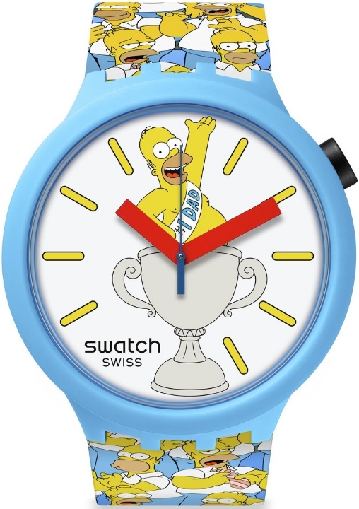 Zegarek Swatch z kolekcji The Simpson to specjalny zegarek na Dzień Ojca z nadrukiem z Homerem Simpson na tarczy i pasku. Koperta, bezel i szkło zostały wykonane z materiału bio. TM & © 20th Television. Matt Groening