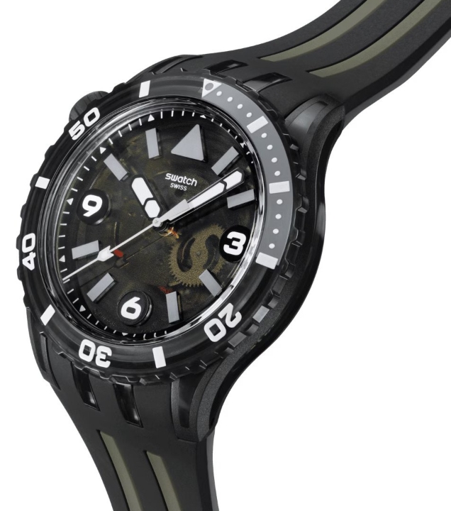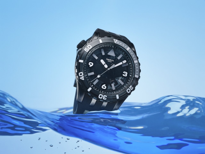 Wyłaniający się z głębin oceanu zegarek przyciąga uwagę elegancką, ciemną stylistyką. Jego matowa czerń materiału Bioceramic i przezroczysty czarny materiał bio stanowią deklarację zarówno ponadczasowości, jak i współczesności.