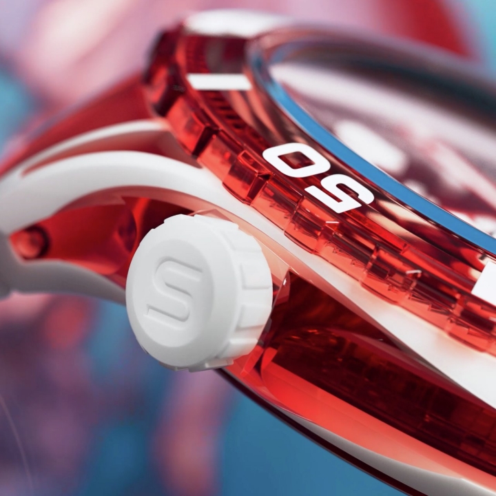 LION'S MANE, niczym wznosząca się fala, aż ryczy swoją żywą czerwono-białą kolorystyką. Przezroczysty czerwony materiał bio pięknie kontrastuje z matową bielą materiału Bioceramic, pulsując energią.