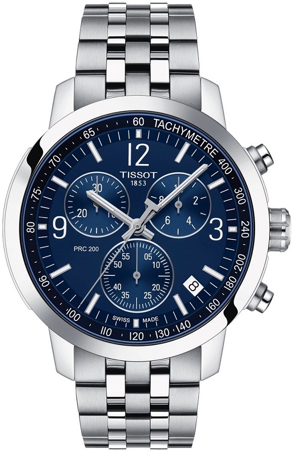 Tissot PRC 200 Chronograph T114.417.11.047.00 to męski zegarek sportowy na stalowej bransolecie w połączeniu szczotkowania i polerowania ze składanym zapięciem. Koperta ze stali nierdzewnej ma średnicę 43 milimetrów i zakręcaną koronkę. Niebieską tarczę chroni szkło szafirowe. Wskazówki i stosowane indeksy pokryte są powłoką luminescencyjną Super-LumiNova®, która gwarantuje doskonałą czytelność w warunkach słabego oświetlenia. Zegarek napędzany jest mechanizmem kwarcowym ETA G10.212 ze wskaźnikiem niskiego poziomu baterii i maksymalnym dziennym odchyleniem dokładności biegu wynoszącym +/- 0,1 sekundy. Zegarek posiada funkcję wyświetlania daty, stoper i skalę tachymetru. Wodoodporność zegarka wynosi 20 ATM i dlatego nadaje się do pływania i snorkelingu.
