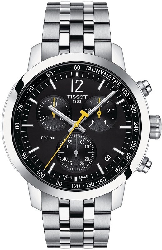 Tissot PRC 200 Chronograph T114.417.11.057.00 to męski zegarek sportowy na stalowej bransolecie w połączeniu szczotkowania i polerowania ze składanym zapięciem. Koperta ze stali nierdzewnej ma średnicę 43 milimetrów i zakręcaną koronkę. Czarną tarczę z żółtymi detalami chroni szafirowe szkiełko. Wskazówki i stosowane indeksy pokryte są powłoką luminescencyjną Super-LumiNova®, która gwarantuje doskonałą czytelność w warunkach słabego oświetlenia. Zegarek napędzany jest mechanizmem kwarcowym ETA G10.212 ze wskaźnikiem niskiego poziomu baterii i maksymalnym dziennym odchyleniem dokładności biegu wynoszącym +/- 0,1 sekundy. Zegarek posiada funkcję wyświetlania daty, stoper i skalę tachymetru. Wodoodporność zegarka wynosi 20 ATM i dlatego nadaje się do pływania i snorkelingu.