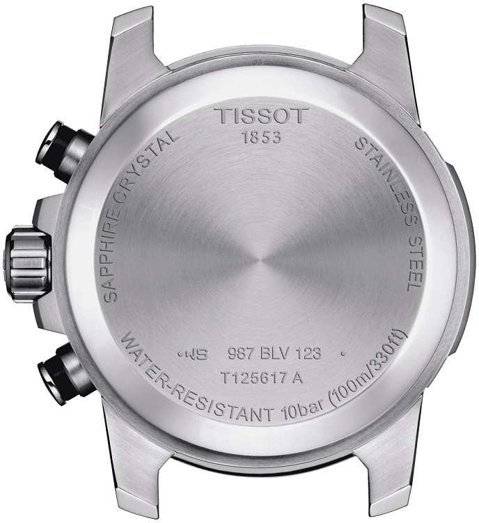 Tissot Supersport Chrono T125.617.17.051.03 to męski zegarek sportowy na niebieskim pasku, wykonany z połączenia gumy i materiału tekstylnego, ze sprzączką w kształcie szpilki. Koperta ze stali nierdzewnej ma średnicę 45,5 milimetra i solidną czarną aluminiową bezel ze skalą tachymetryczną. Czarna tarcza z niebieskimi tarczami pomocniczymi jest chroniona trwałym szafirowym kryształem. Wskazówki i stosowane indeksy pokryte są powłoką luminescencyjną Super-LumiNova®, która gwarantuje doskonałą czytelność w warunkach słabego oświetlenia. Zegarek napędzany jest mechanizmem kwarcowym ETA G10.212 o maksymalnym dziennym odchyleniu +/- 0,1 sekundy. Zegarek posiada funkcję stopera, datownik oraz wskaźnik niskiego poziomu naładowania baterii. Dzięki wodoodporności 10 ATM nadają się do pływania i snorkelingu.