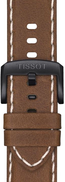 Tissot Supersport Chrono T125.617.36.051.01 to męski zegarek sportowy na brązowym skórzanym pasku z kontrastowymi szwami i zapinaną na szpilkę klamrą. Koperta ze stali nierdzewnej z wykończeniem PVD w kolorze czarnym ma średnicę 45,5 milimetra i solidną czarną aluminiową bezel ze skalą tachymetryczną. Czarną tarczę ze szlifem słonecznym chroni trwałe szkło szafirowe. Wskazówki i stosowane indeksy pokryte są powłoką luminescencyjną Super-LumiNova®, która gwarantuje doskonałą czytelność w warunkach słabego oświetlenia. Zegarek napędzany jest mechanizmem kwarcowym ETA G10.212 o maksymalnym dziennym odchyleniu +/- 0,1 sekundy. Zegarek posiada funkcję stopera, datownik oraz wskaźnik niskiego poziomu naładowania baterii. Dzięki wodoodporności 10 ATM nadają się do pływania i snorkelingu.