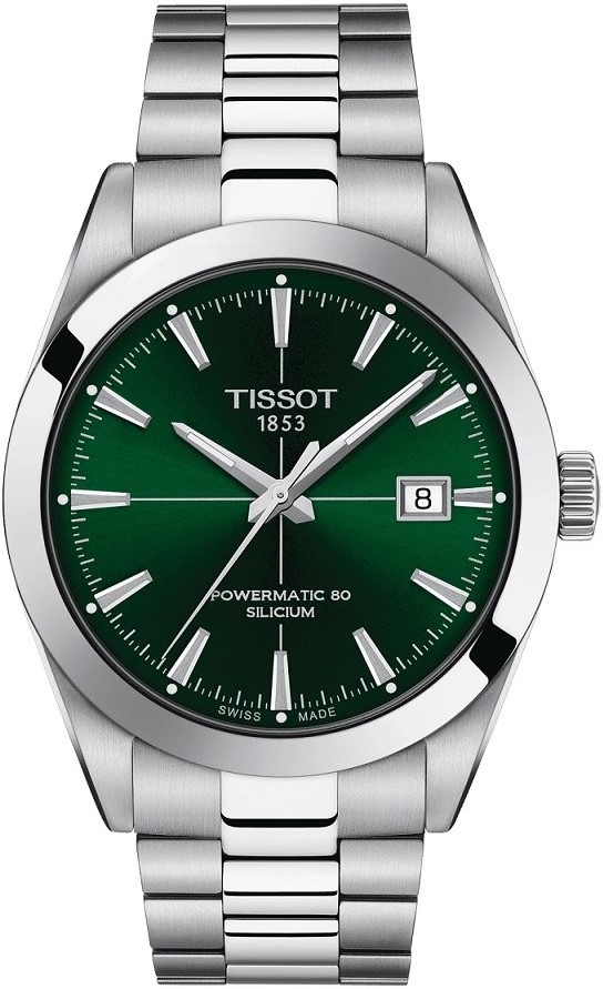 Tissot Gentleman Powermatic 80 Silicium T127.407.11.091.01 to męski automatyczny zegarek na stalowej bransolecie w połączeniu szlifu i połysku z zapięciem motylkowym. Koperta ze stali nierdzewnej ma średnicę 40 milimetrów i przezroczysty dekiel. Zielona tarcza ze szlifem słonecznym i wskazaniem daty jest chroniona wytrzymałymszkłem szafirowym z powłoką antyrefleksyjną. Zastosowane indeksy godzinowe, podobnie jak wskazówki, pokryte są powłoką luminescencyjną Super-LumiNova®, która gwarantuje doskonałą czytelność w warunkach słabego oświetlenia. Zegarek napędzany jest mechanizmem Powermatic 80.811 z naciągiem automatycznym i rezerwą chodu na poziomie około 80 godzin, który posiada funkcję hakowania (zatrzymywanie wskazówka sekundowa, gdy koronka jest wyciągnięta do skrajnych pozycji), a w razie potrzeby można ją również nakręcić ręcznie za pomocą koronki. Dzięki zastosowaniu krzemowego, antymagnetycznego włosia w kole zamachowym, kaliber ten charakteryzuje się dużą odpornością na działanie pola magnetycznego. Dzięki wodoszczelności 10 ATM zegarek nadaje się do pływania i snorkelingu.
