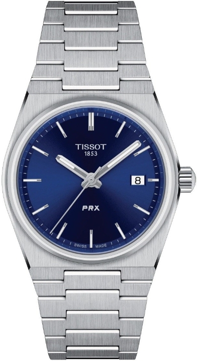 Tissot PRX Quartz T137.210.11.041.00 to unisex zegarek na baterie na zintegrowanej stalowej bransolecie ze szczotkowanym wykończeniem i zapięciem motylkowym. Koperta ze stali nierdzewnej ma średnicę 35 milimetrów. Ciemnoniebieska tarcza ze szlifem słonecznym i wskaźnikiem daty jest chroniona wytrzymałym szkłem szafirowym. Zastosowane indeksy godzinowe, podobnie jak wskazówki, pokryte są powłoką luminescencyjną Super-LumiNova®, która gwarantuje doskonałą czytelność w warunkach słabego oświetlenia. Zegarek napędzany jest szwajcarskim mechanizmem kwarcowym ETA F06.115 ze wskaźnikiem niskiego poziomu naładowania baterii EOL (End of Life) oraz technologią HeavyDrive, która eliminuje wpływ silnych wstrząsów na ruch. Wodoodporność zegarka wynosi 10 ATM i dlatego nadaje się do pływania i snorkelingu.