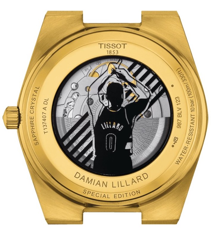 Tissot PRX Powermatic 80 Damian Lillard Special Edition T137.407.33.051.00 to męski zegarek automatyczny na zintegrowanej stalowej bransolecie w kolorze złota PVD z zapięciem motylkowym. To specjalna edycja poświęcona amerykańskiemu zawodowemu koszykarzowi Damianowi Lillardowi, jednej z głównych gwiazd drużyny NBA Milwaukee Bucks. Koperta ze stali nierdzewnej pokrytej złotem PVD ma średnicę 40 milimetrów i przezroczysty dekiel z sylwetką Damiana świętującego „Czas Dame”. Te dwa słowa można znaleźć wygrawerowane na wewnętrznej ramce wraz z akronimem „DDKK” będącym hołdem dla jego rodziny oraz „YKWTII” w lewym dolnym rogu, co jest skrótem od „You Know What Time It Is” poprzedzającego kultowe momenty z „Czasu Damy”. Czarną tarczę z datownikiem i wzorem złożonym z zer nawiązujących do numeru koszulki Damiana chroni trwałe szkło szafirowe z powłoką antyrefleksyjną. Monogram Damiana zdobi wskazówkę sekundową. Zastosowane indeksy godzinowe, podobnie jak wskazówki, pokryte są powłoką luminescencyjną Super-LumiNova®, która gwarantuje doskonałą czytelność w warunkach słabego oświetlenia. Zegarek napędzany jest mechanizmem Powermatic 80 z naciągiem automatycznym i rezerwą chodu wynoszącą około 80 godzin. Dzięki zastosowaniu antymagnetycznego włosia koła zamachowego Nivachron™ wykonanego ze stopu tytanu, w opracowaniu którego fabryka Audemars Piguet uczestniczyła wspólnie ze Swatch Group, kaliber ten charakteryzuje się dużą odpornością na działanie pola magnetycznego. Ten mechanizm z funkcją hakowania można w razie potrzeby nakręcić również ręcznie za pomocą sygnowanej koronki. Wodoodporność zegarka wynosi 10 ATM i dlatego nadaje się do pływania i snorkelingu.
