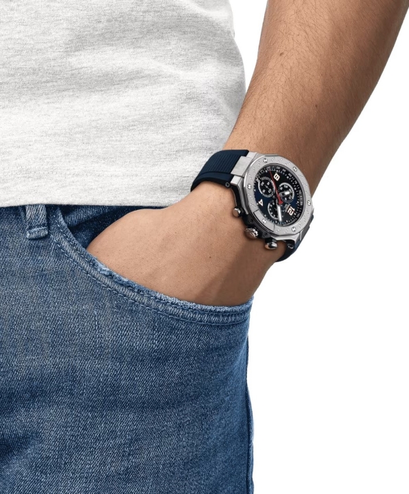 Tissot T-Race MotoGP 75th Anniversary 2024 Limited Edition T141.417.17.047.00 to męski zegarek sportowy na baterię, na niebieskim gumowym pasku ze sprzączką. Koperta ze stali nierdzewnej ma średnicę 45 milimetrów, dekluę ozdobioną logo MotoGP i wewnętrzną bezel ze skalą tachymetryczną. Ciemnoniebieska tarcza ze szlifem słonecznym, datownik i chronograf są chronione trwałym szkłem szafirowym z powłoką antyrefleksyjną. Zastosowane indeksy godzinowe, podobnie jak wskazówki, pokryte są powłoką luminescencyjną Super-LumiNova®, która gwarantuje doskonałą czytelność w warunkach słabego oświetlenia. Zegarek napędzany jest mechanizmem kwarcowym ETA G10.212 z dokładnością +/- 10 sekund na rok i sygnalizacją niskiego poziomu baterii. Wodoodporność zegarka wynosi 10 ATM i dlatego nadaje się do pływania i snorkelingu. Jest to limitowana edycja 8000 sztuk na całym świeciewydana z okazji 75. rocznicy MotoGP™ i dlatego jest dostępna w specjalnym minikasku, który zachwyci wszystkich fanów sportów motorowych, a także designem zegarka inspirowanym tym sportem . Tissot jest oficjalnym chronometrażystą zawodów MotoGP™ od 1999 roku.