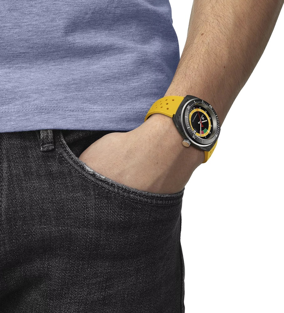 Kopertę wykonano z połączenia węgla i stali. Pozostała jednak wyrazista kolorystyka modelu, Tissot zastosował je do detali tarczy i pasuje do niej kolor gumowego paska, który swoją drogą ma bardzo pomysłowo zaprojektowane zapięcie. Model Sideral z mechanicznym mechanizmem samonakręcającym jest wyraźnym dowodem na to, jak Tissot potrafi połączyć swoją przeszłość z prawdziwie nowoczesnym podejściem.