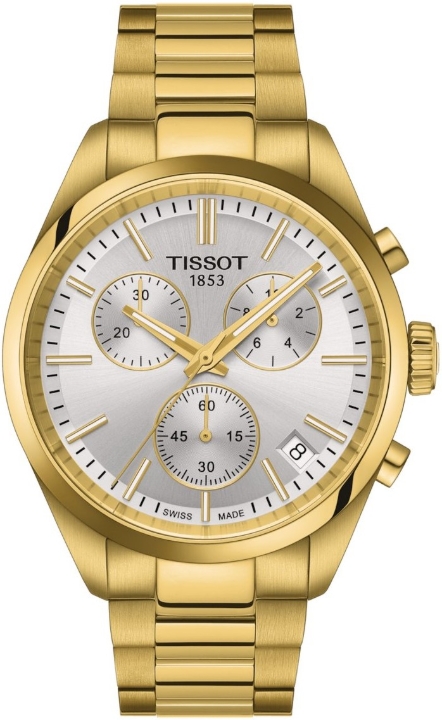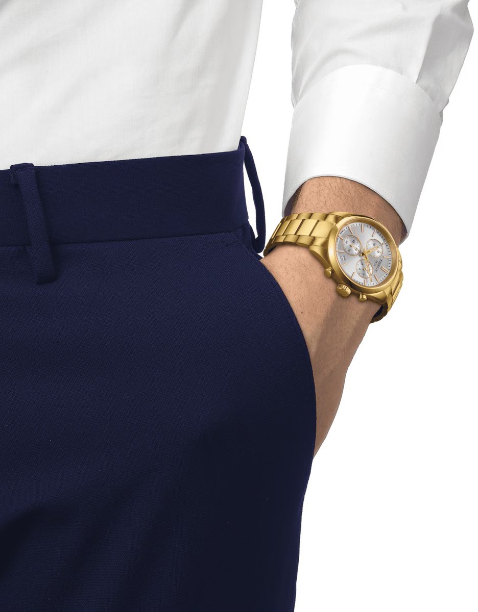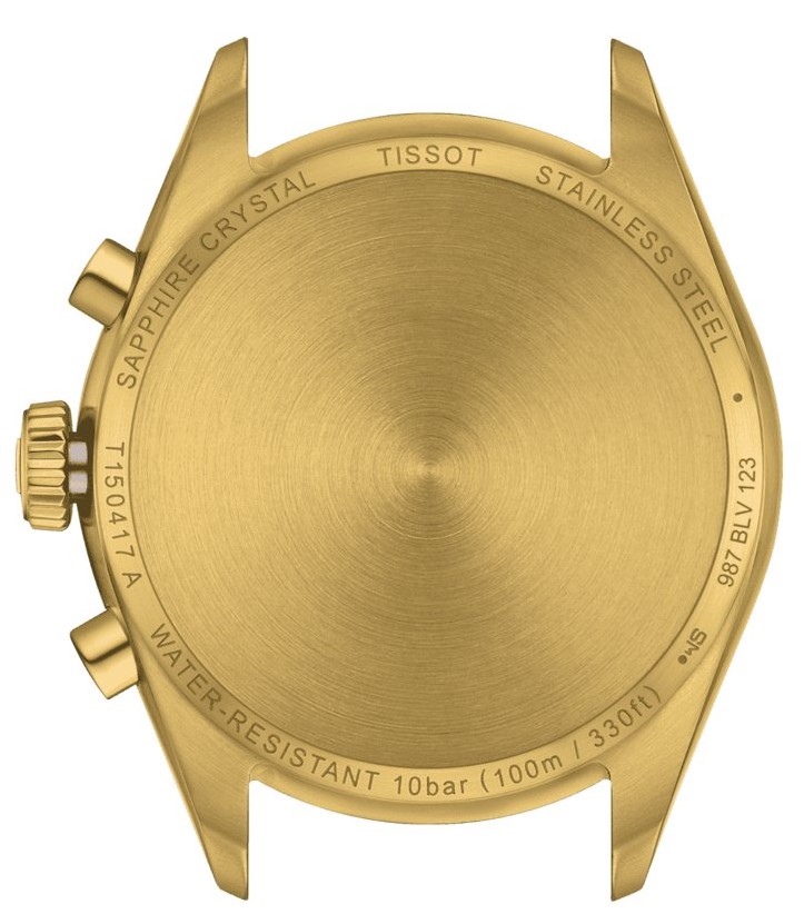 Tissot PR 100 Chronograph T150.417.33.031.00 to męski zegarek na bransolecie ze szczotkowanej stali z powłoką PVD w kolorze złota i zapięciem motylkowym. Koperta ze stali nierdzewnej w tym samym kolorze ma średnicę 40 milimetrów. Srebrna tarcza ze szlifem słonecznym, chronograf i datownik są chronione trwałym szafirowym szkiełkiem. Wskazówki i indeksy pokryte są luminescencyjną warstwą Super-LumiNova®, która gwarantuje doskonałą czytelność w złych warunkach oświetleniowych. Zegarek napędzany jest mechanizmem kwarcowym G10.212 ze wskaźnikiem niskiego poziomu naładowania baterii. Dzięki wodoszczelności 10 ATM zegarek nadaje się do pływania i snorkelingu.