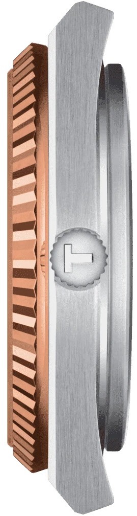 Tissot PRX Powermatic 80 T931.407.41.041.00 to męski zegarek automatyczny na zintegrowanej stalowej bransolecie ze szczotkowanym wykończeniem i zapięciem motylkowym. Koperta ze stali nierdzewnej ma średnicę 40 milimetrów, przezroczysty dekiel i bezel z 18-karatowego różowego złota. Ciemnoniebieska tarcza ze szlifem słonecznym i wskazaniem daty jest chroniona wytrzymałym szkłem szafirowym z powłoką antyrefleksyjną. Zastosowane indeksy godzinowe, podobnie jak wskazówki, pokryte są luminescencyjną powłokąSuper-LumiNova®, która gwarantuje doskonałą czytelność w warunkach słabego oświetlenia. Zegarek napędzany jest mechanizmem Powermatic 80.111 z naciągiem automatycznym i rezerwą chodu wynoszącą około 80 godzin. Dzięki zastosowaniu antymagnetycznego włosia koła zamachowego Nivachron™ wykonanego ze stopu tytanu, w opracowaniu którego fabryka Audemars Piguet uczestniczyła wspólnie ze Swatch Group, kaliber ten charakteryzuje się dużą odpornością na działanie pola magnetycznego. Ten mechanizm z funkcją hakowania można w razie potrzeby nakręcić również ręcznie za pomocą sygnowanej koronki. Wodoodporność zegarka wynosi 10 ATM i dlatego nadaje się do pływania i snorkelingu.